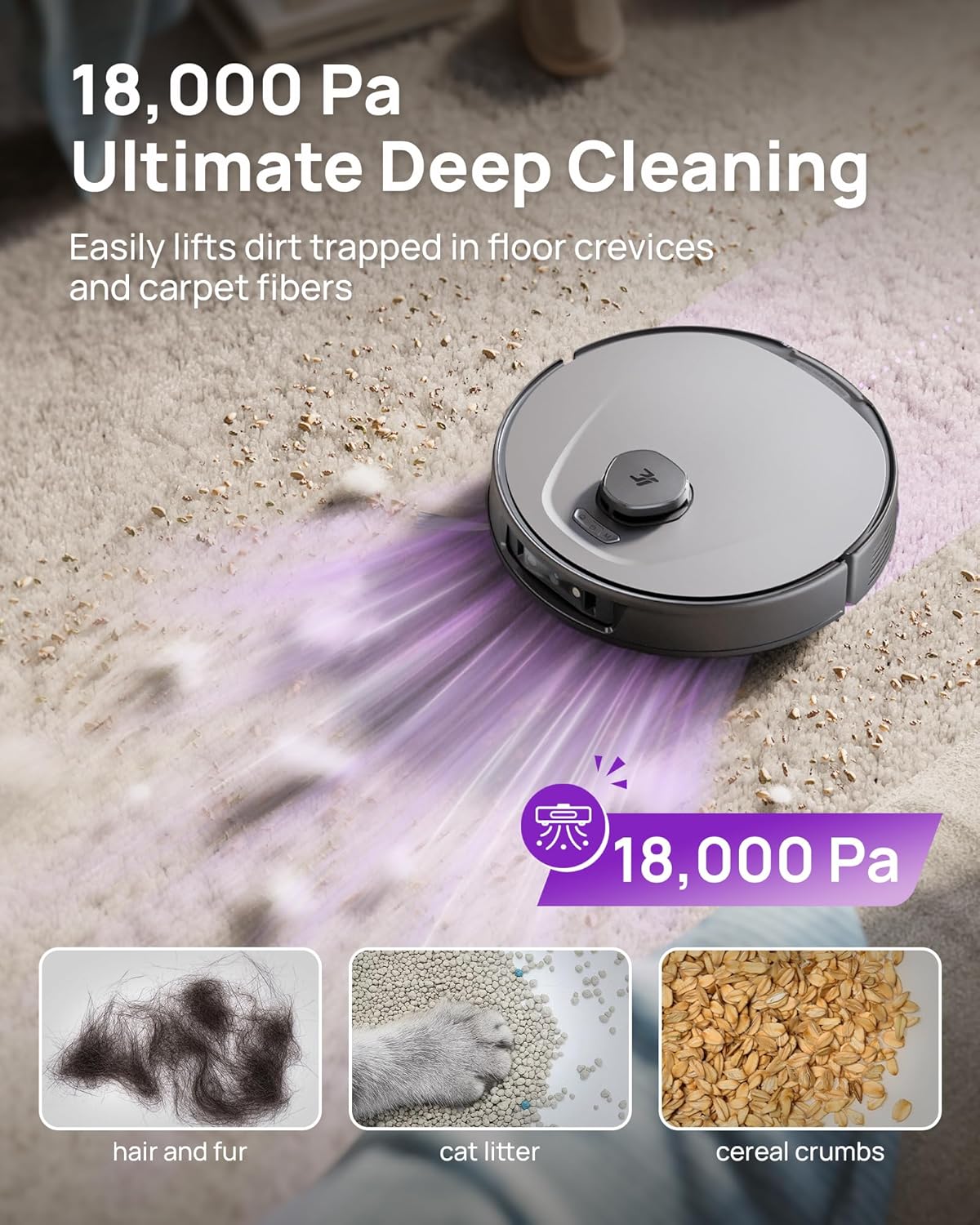 18,000 Pa Ultra-Powerful Suction: P10 Ultra robotic vacuum lifts everything from hair to breadcrumbs on multi surfaces like hardwood floors and carpets. It automatically boosts suction and raises the mop on carpets for a deep yet dry clean every time.