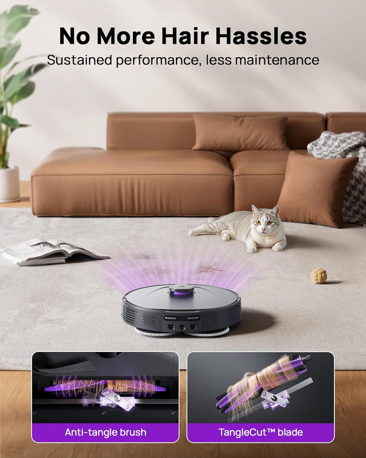 Tangle-Free Clean: Auto TangleCut technology slices hair off the roller brush after cleaning, keeping your robotic vacuum cleaner at peak performance without the mess. Perfect for homes with pet hair.