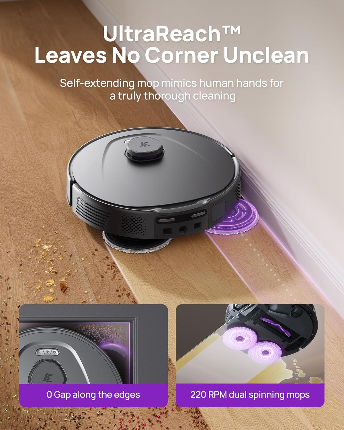 AI-Powered DirtScan: Identifies dirt types, even in the dark with auto illumination, and adapts cleaning automatically, from repeating mopping for tough stains to boosting suction for larger debris like cat litter.