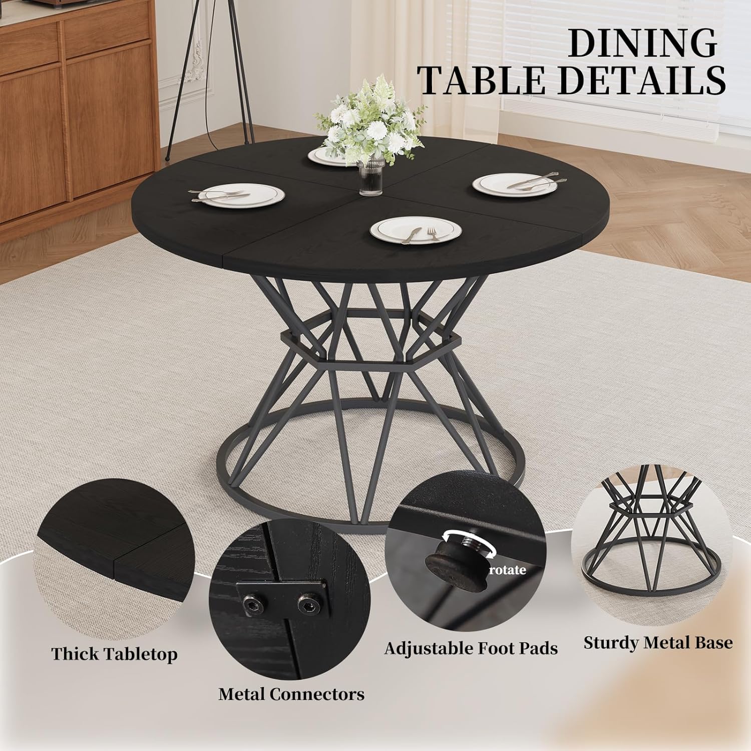 Sturdy Construction - Crafted with a premium iron tube base, our round kitchen table set ensures stability and durability without compromising its stylish appeal. Table dimensions: 47.24"W x 29.53"H; Chair dimensions: 18.1"W x 35"H x 18.8"D.