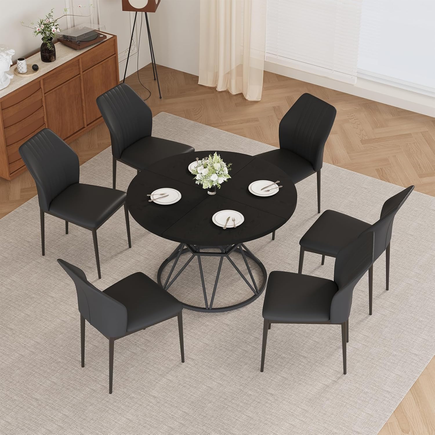 7-Piece Round Dining Table Set - Our dining room table and chairs includes one dining table and six dining chairs.Whether for family gatherings or party events, it provides ample dining space.