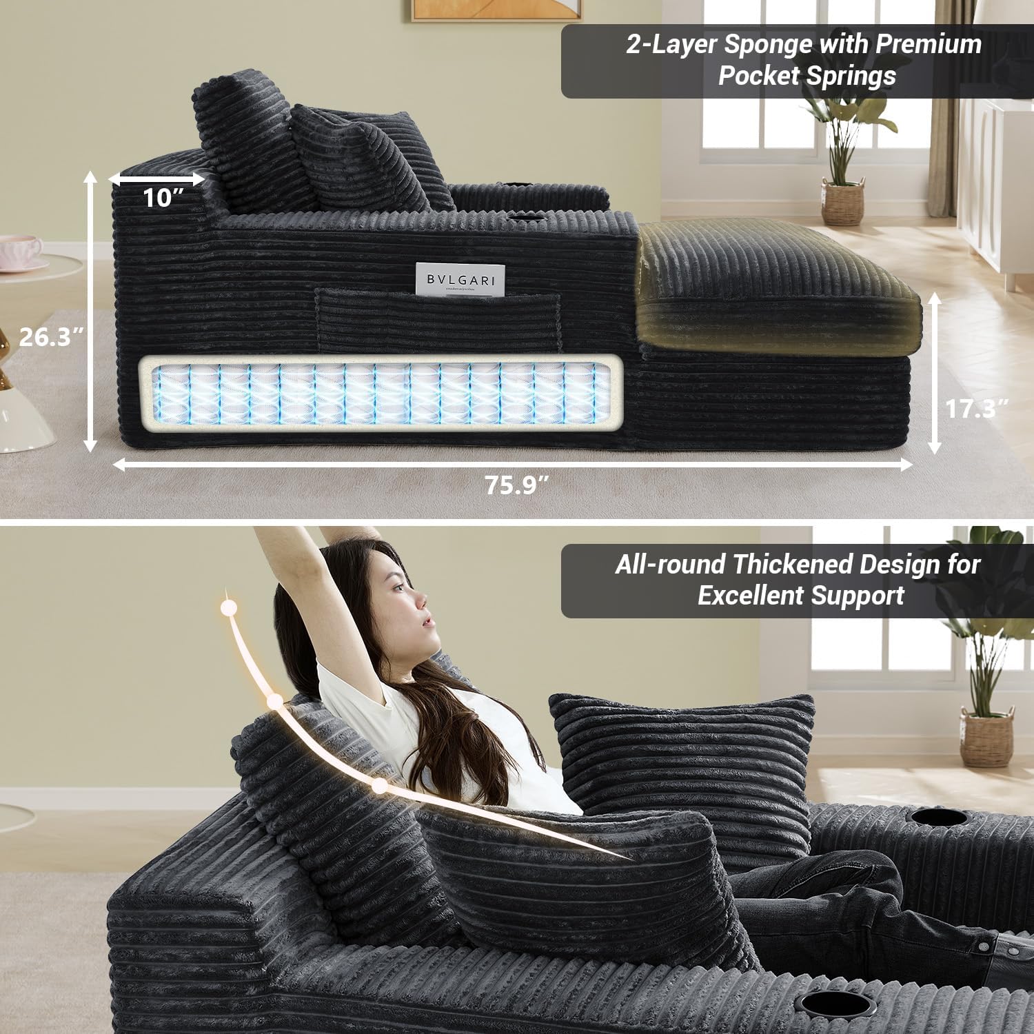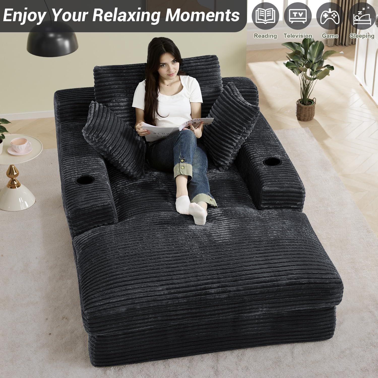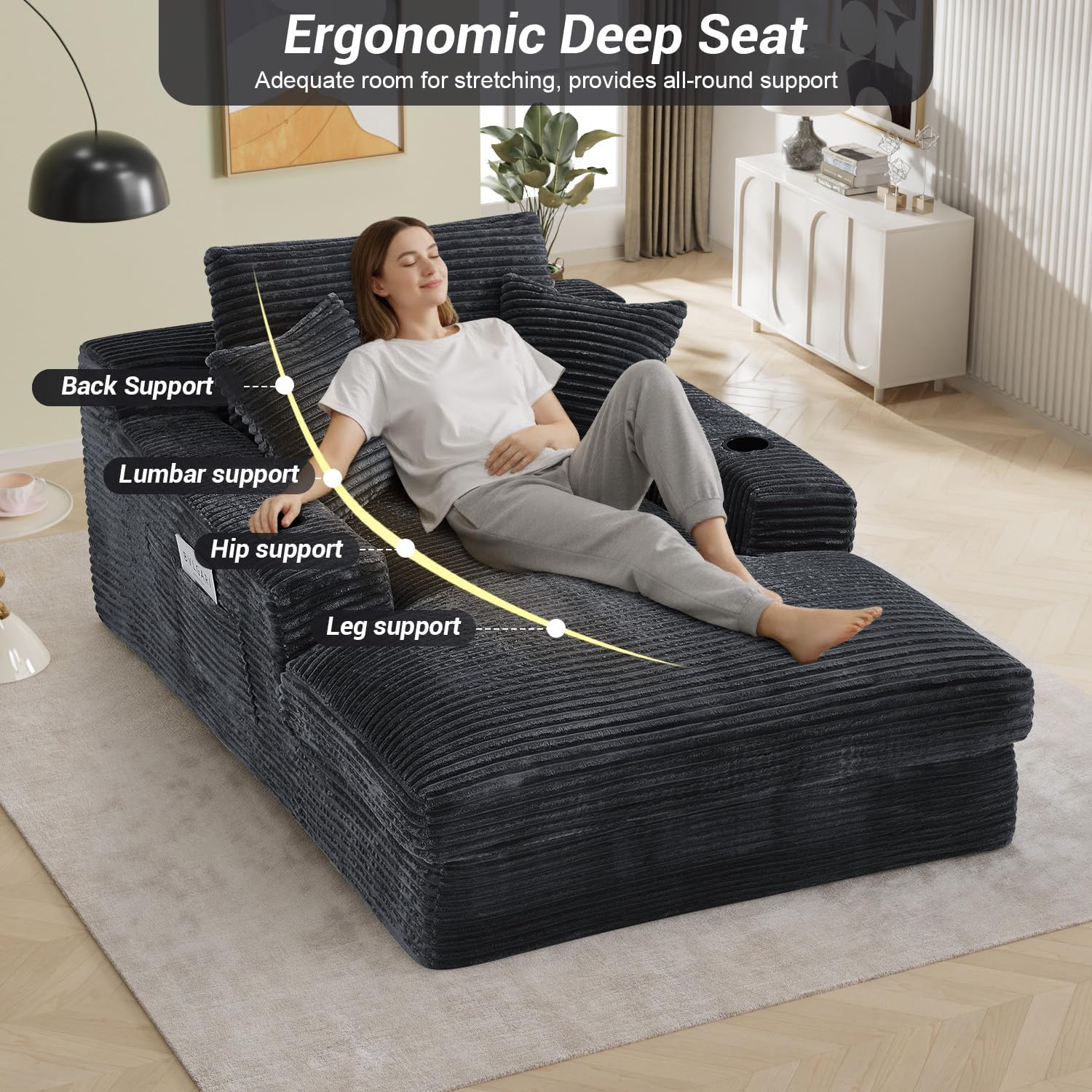 Fashionable & Versatile: Wrapped in striped corduroy fabric, the oversized chaise lounge presents a charming striped texture. Whether it is simple, modern or Nordic style, its elegant design and neutral color can be perfectly integrated with various home decorations, adding exquisite elegance to any living spaces!