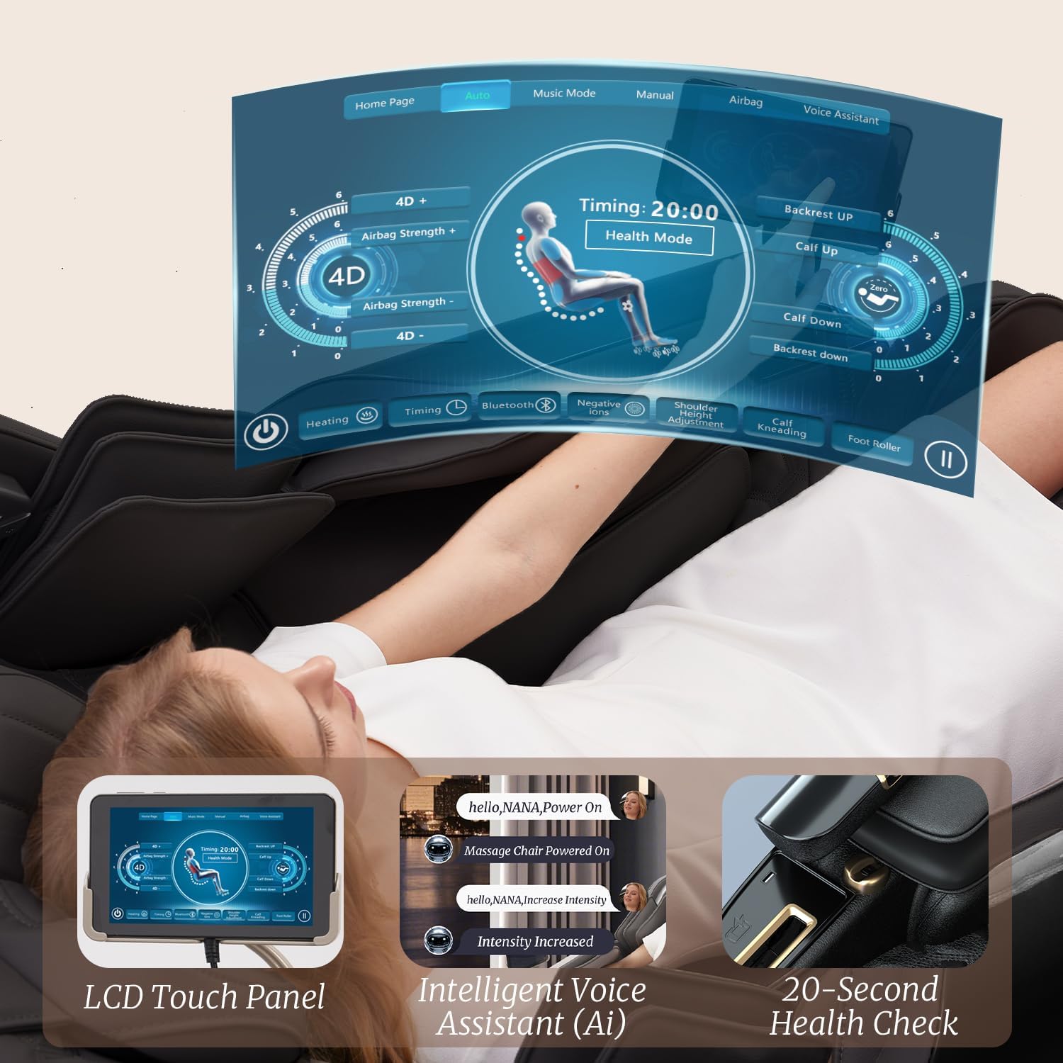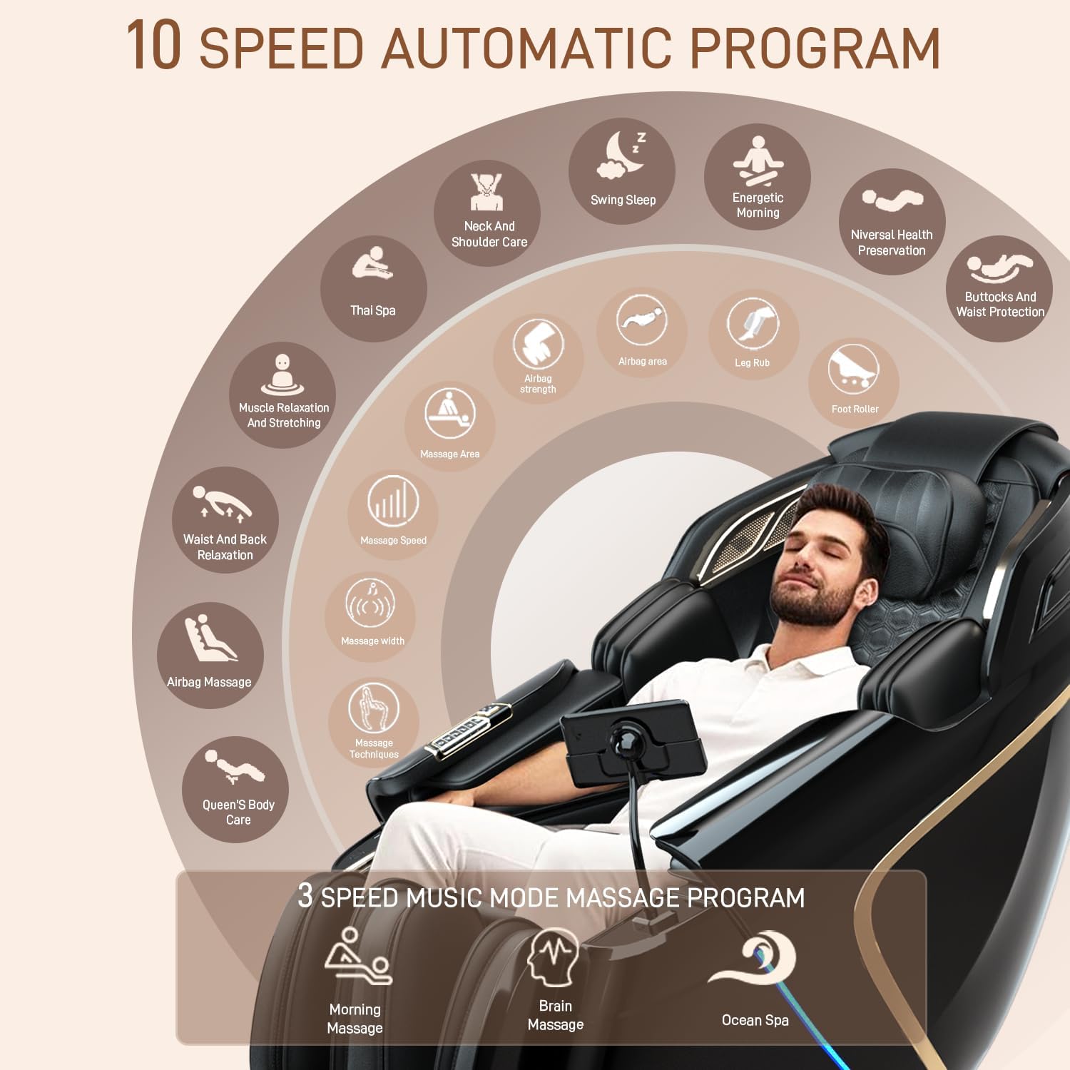 Large Touchscreen & 13 Automatic Programs Take full command of your massage with the brilliant 10.1-inch TFT touchscreen display. Easily navigate through 13 one-touch automatic programs and 6 manual massage techniques (including Shiatsu, Kneading, Tapping, and more) to find the perfect routine for your mood and needs. Customize intensity with 6 levels of adjustment for both the rollers and airbags.
