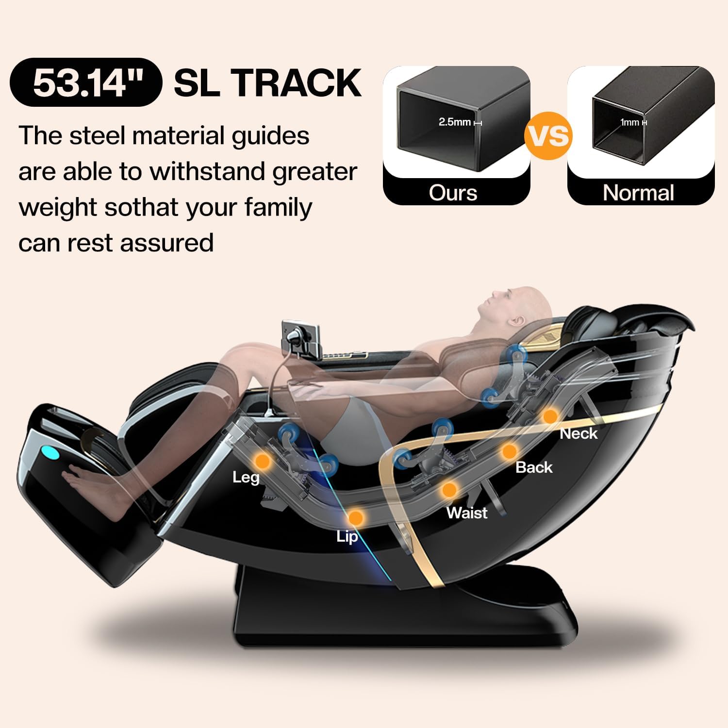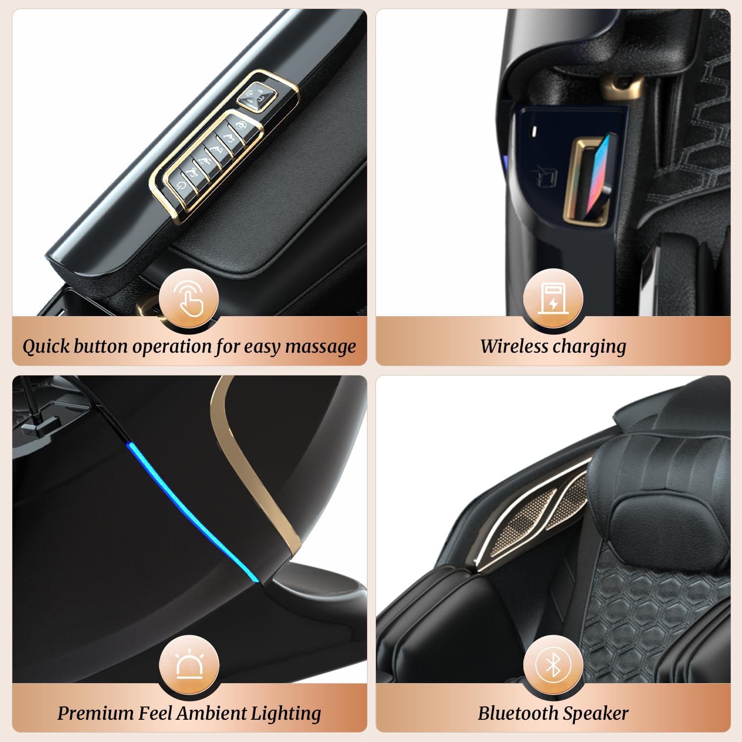 Premium Build with Zero Gravity & Heating Recline into a weightless zero-gravity position to maximize massage effectiveness and reduce spinal pressure. Soothe aching muscles with the gentle lower back heating function. The chair's robust ABS external frame is upholstered in high-quality, hydrolytic-resistant synthetic leather, ensuring durability and easy cleaning. Convenient shortcut buttons on the side offer instant access to key functions.