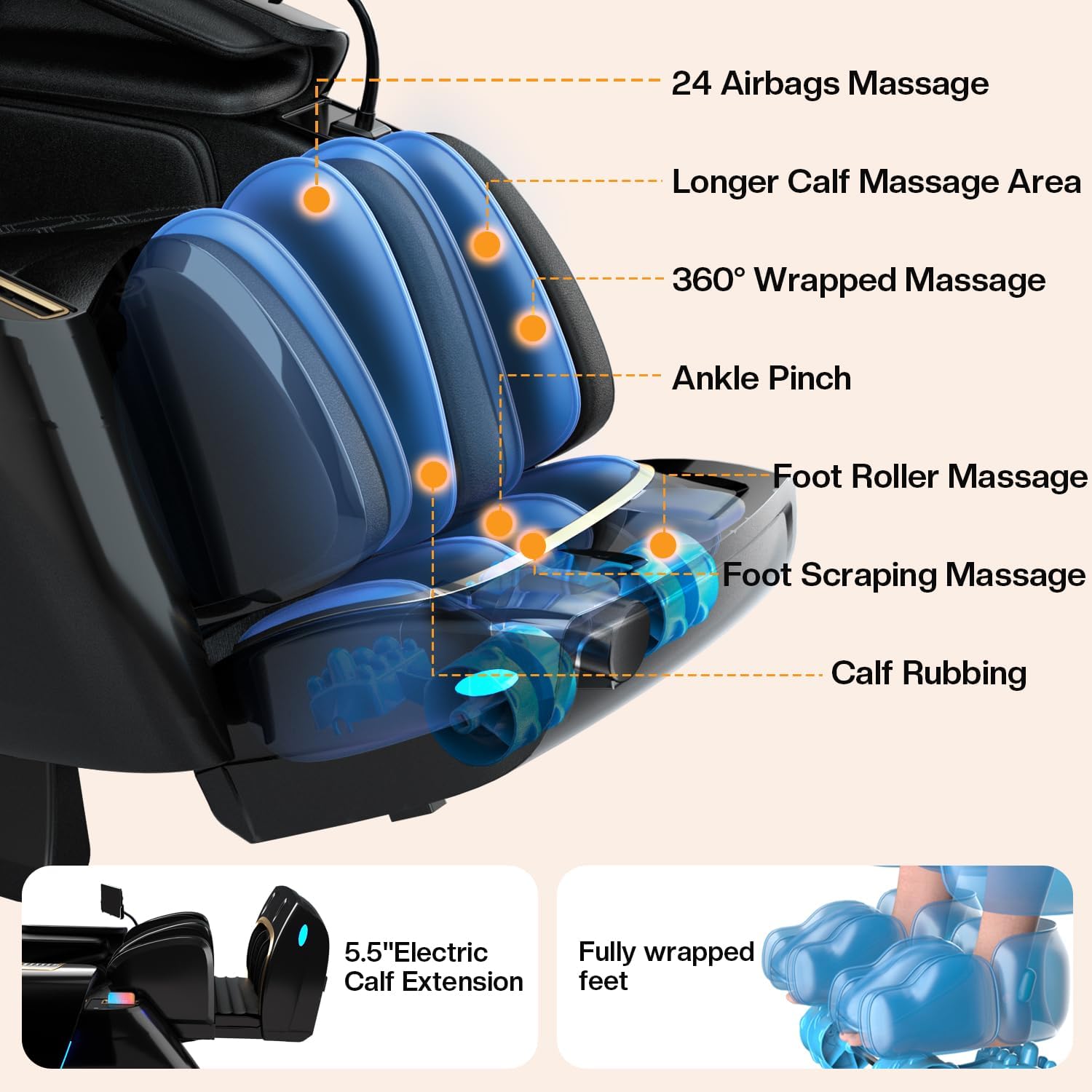Patented Leg Care & Full-Body Air Compression Experience revolutionary leg relief with our patented calf massage design and foot rollers that provide a combination of kneading and scraping therapy. Your entire body is enveloped by a system of advanced airbags that rhythmically compress your arms, shoulders, waist, hips, and legs to relieve tension and boost circulation.