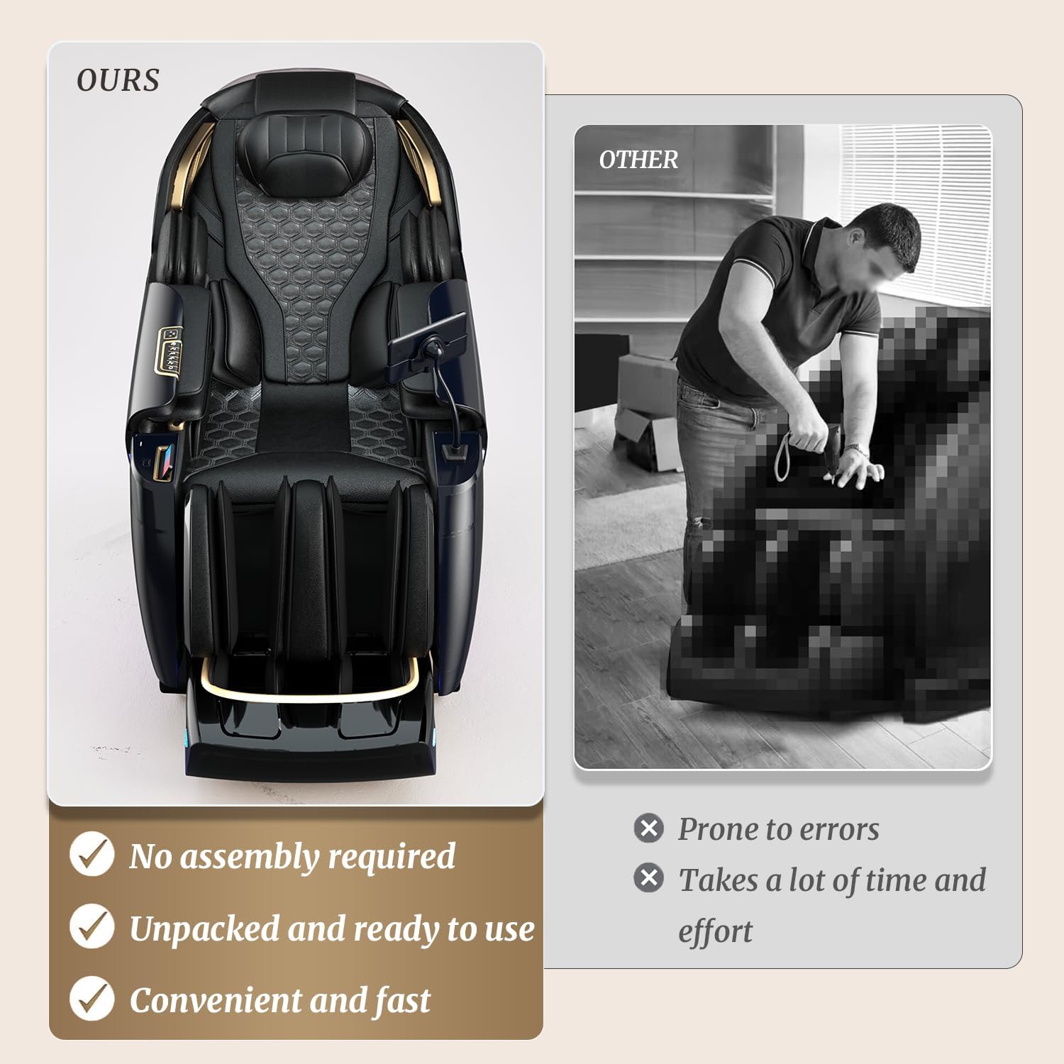 No Assembly & USA Warranty with On-Site Service Enjoy immediate relaxation straight out of the box with our one-piece, no-installation design. Purchasing with confidence is easy thanks to our local USA team. We provide a 5-year warranty on the movement mechanism, a 3-year warranty on parts, and 1 year of in-home on-site service (via Amazon after-sales contact), so professional help is always just a call away.