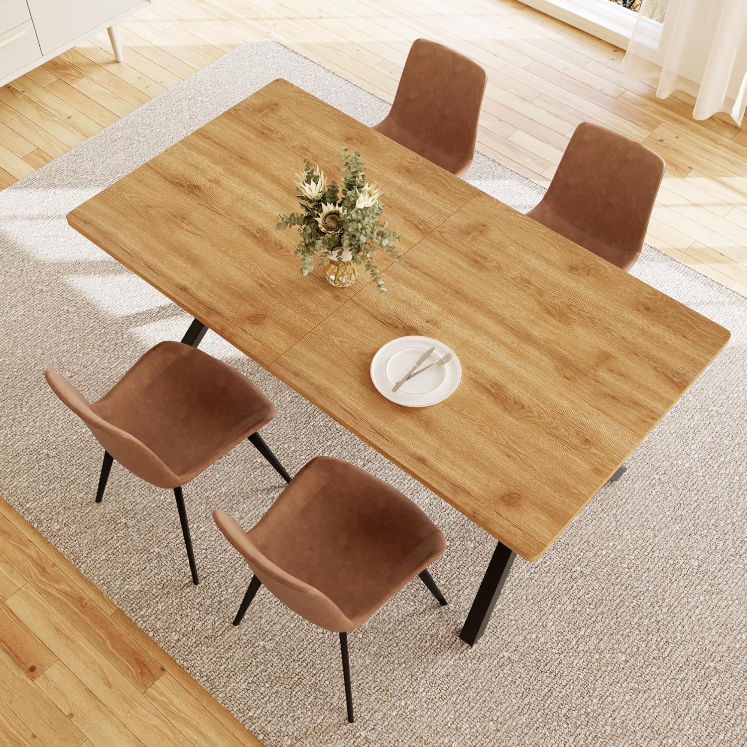 • 5-Piece Dining Table Set for 4-6 People, 63" MDF Kitchen Table with 4 Upholstered Chairs, Metal Legs for Dining Room, Kitchen(Oak Table+4 Brown Chairs)