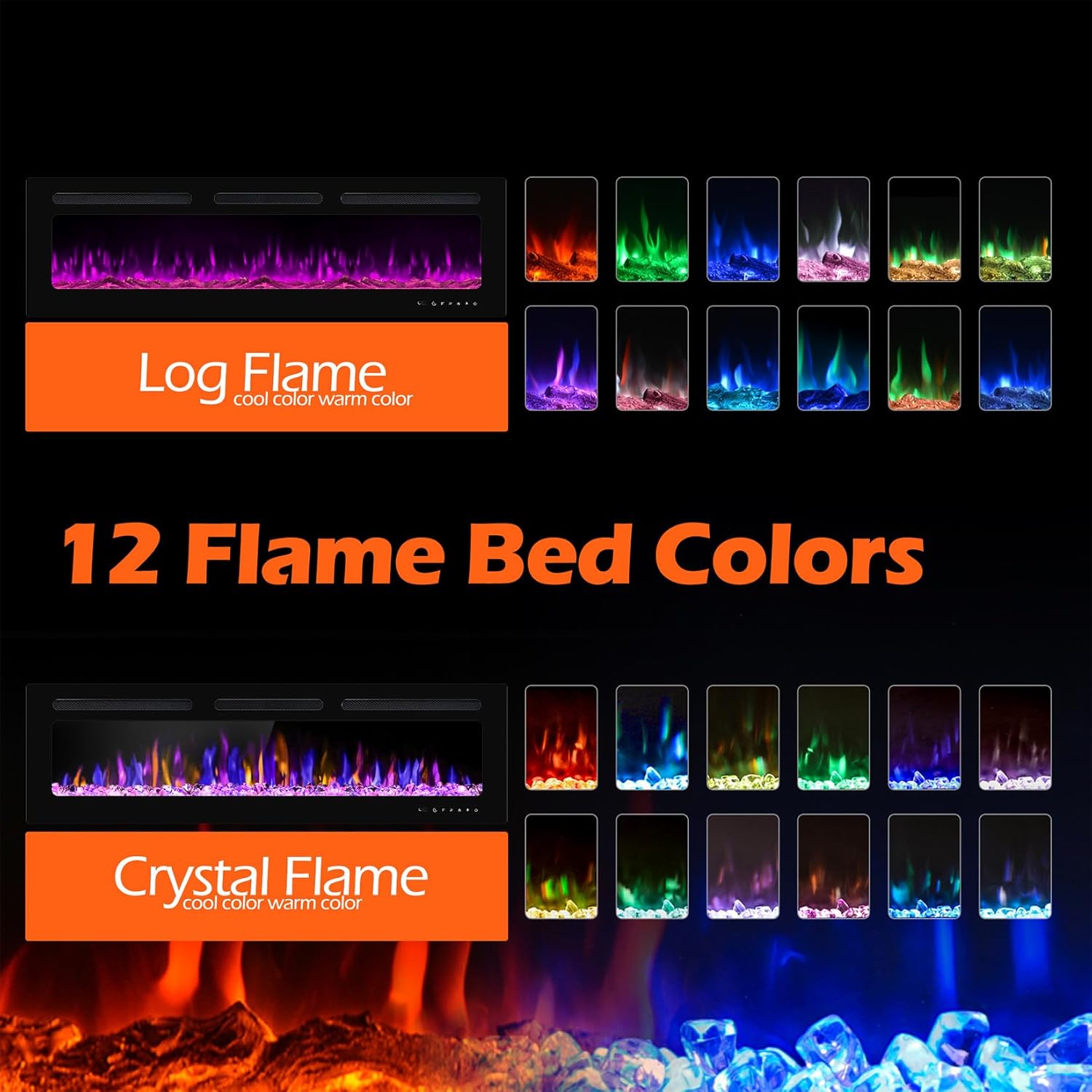 FUN FEATURES : The multiple combinations of colors, flame speed and dimmer controls offer so many options to really set the ambiance. It comes with crystal and carbon log rocks to meet your requirement. With the 12 static colors or color cycling, the flame and rocks look so great and pretty.