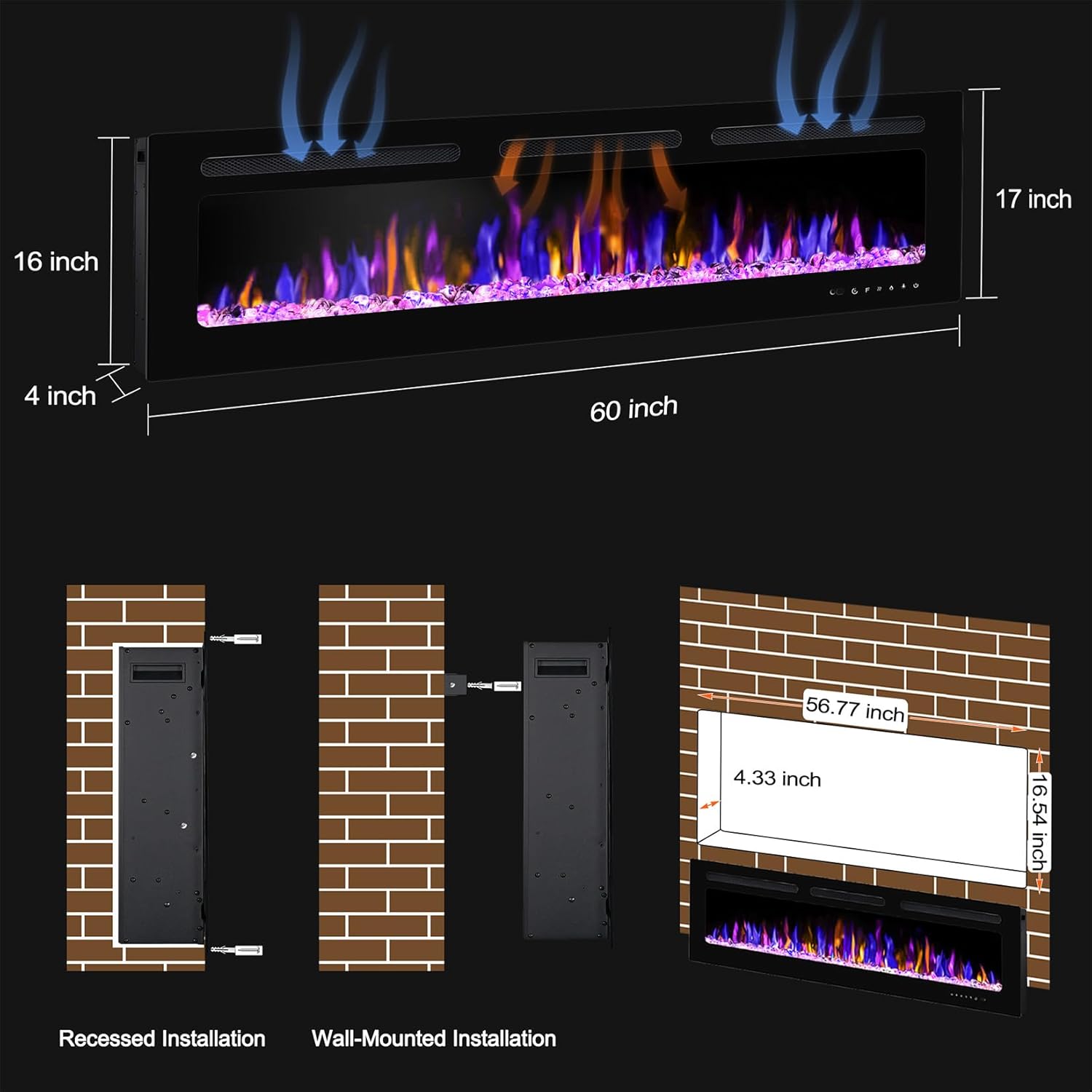 SPECIFICATION : Dimension 60"L*17"W*4"D, 750W/1500W Heat setting; Package include -1x electric fireplace, 1x carbon log, 1 pack crystal stone, 1x installation manual and hardware accessories.