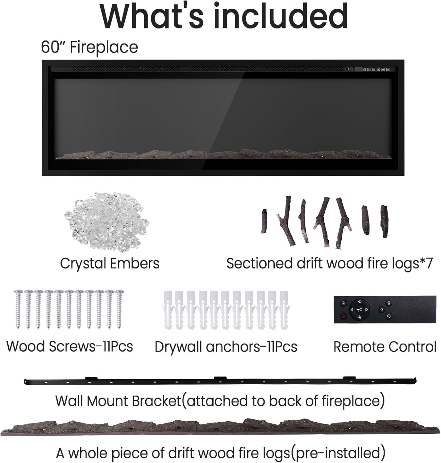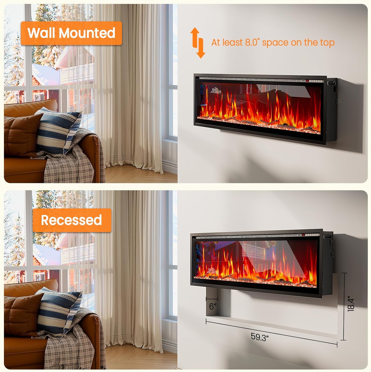 Wall Mounted or Recessed InstallationThis electric fireplace fits seamlessly in wall-mounted or in-wall recessed setups for living rooms, bedrooms, or offices. Measures 60" x 19.3" x 5.8", weighs 68.4 lbs, and includes a 5.9 ft power cable. Keep at least 6" from the floor and 8" from a mantel or ceiling for safe installation.