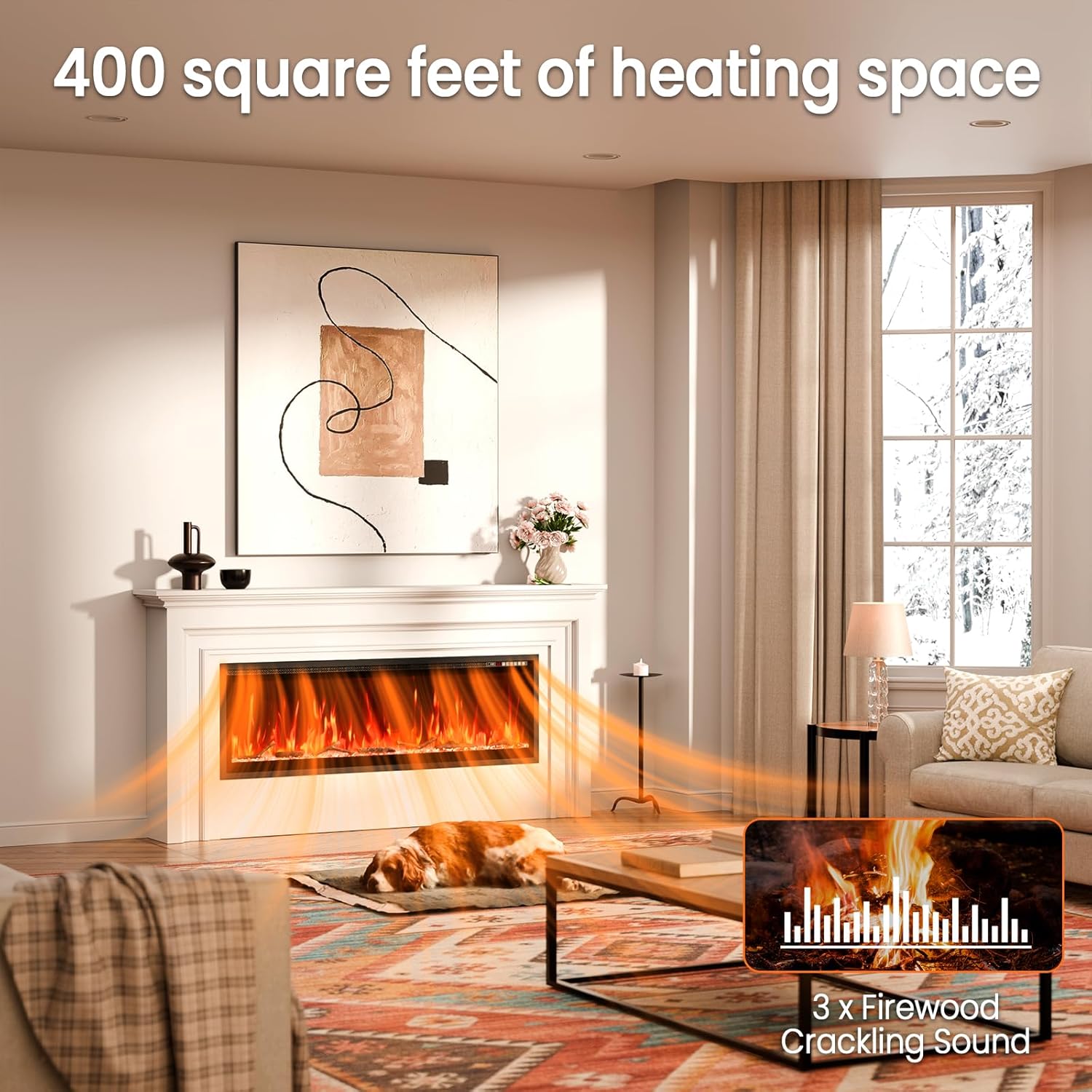 Personalized Comfort & Quiet HeatingEnjoy customizable warmth with this electric fireplace heater, featuring adjustable heat output, a built-in thermostat (62F86F), and 1400W heater that warms up to 400 sq. ft. Designed for everyday comfort, it runs quietly at 45 dB and includes a 08 hour timer for energy-efficient use.
