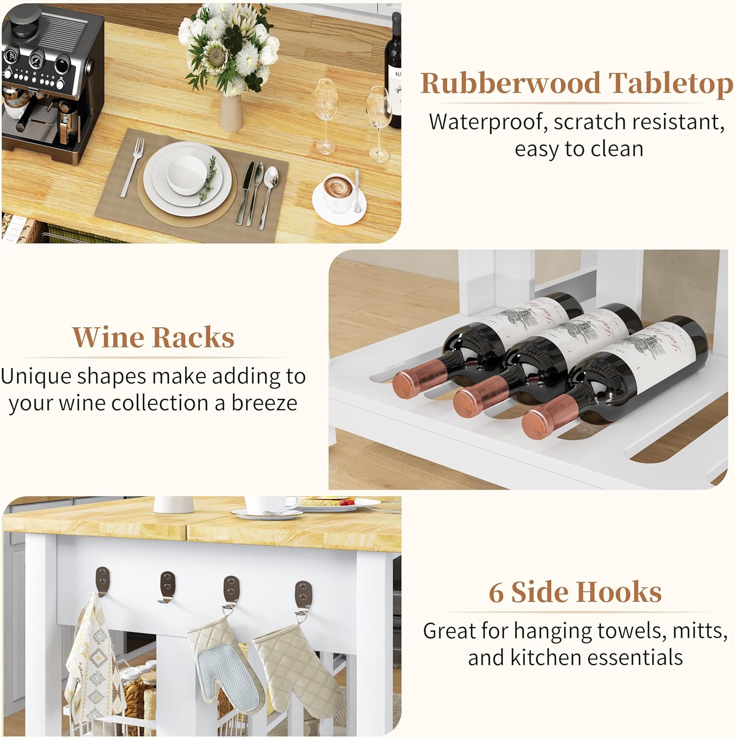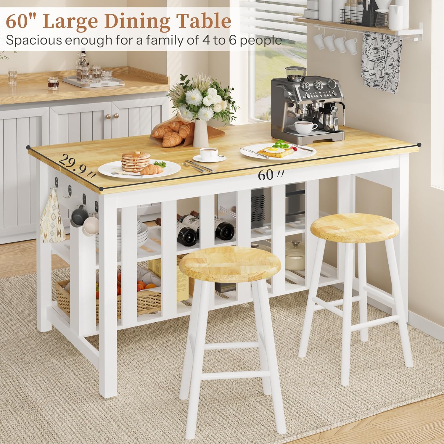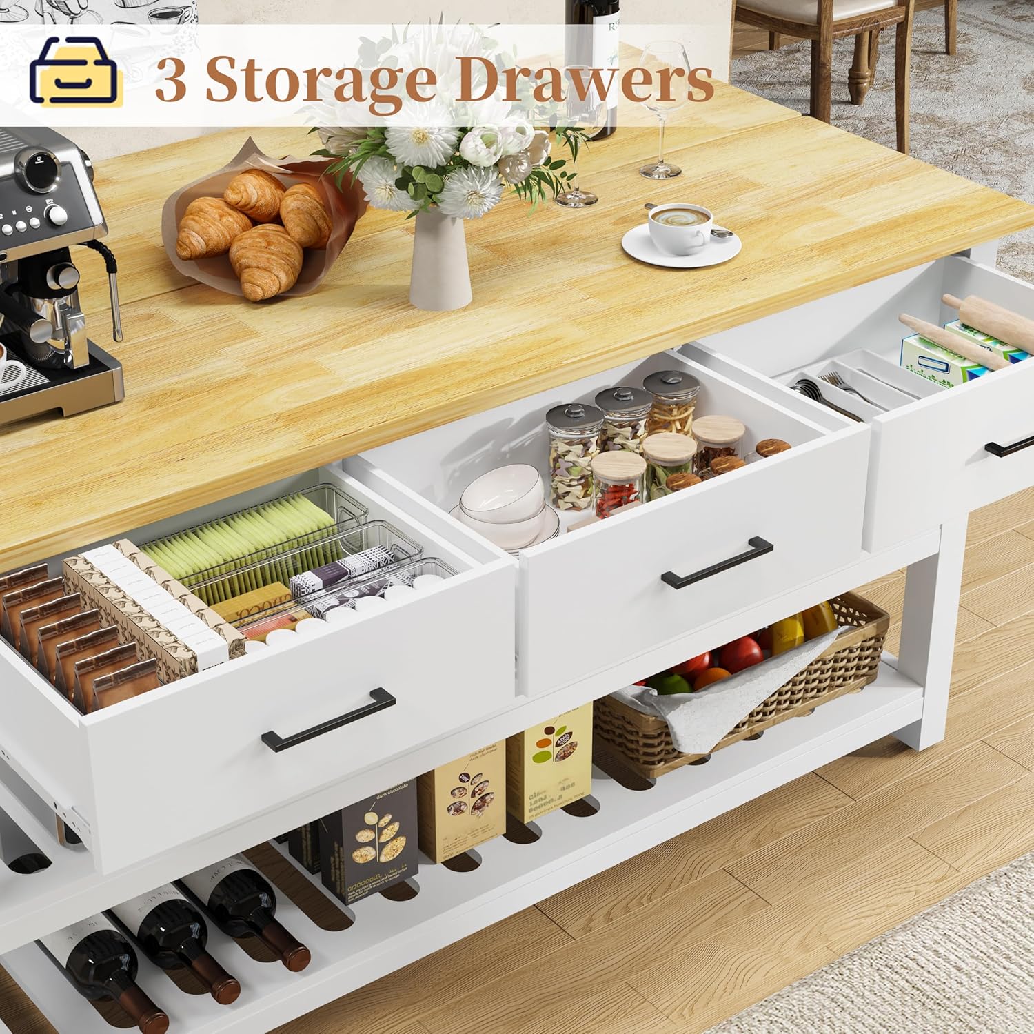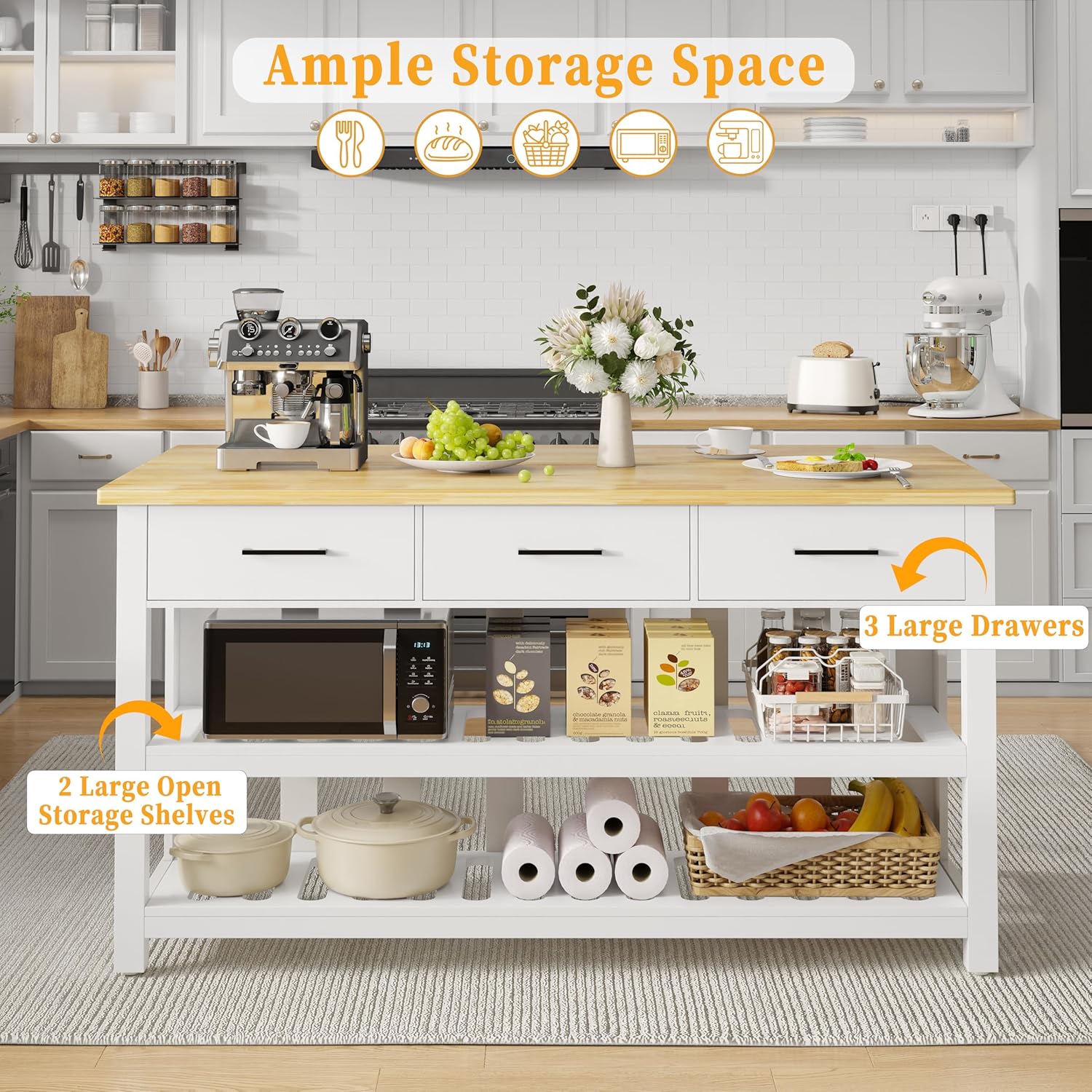 • 60" Solid Rubberwood Kitchen Island with Power Outlets - Extra Large Work Surface, 3 Drawers & 2 Open Shelves Storage Cabinet for Kitchen Dining Room, Farmhouse Style (White)