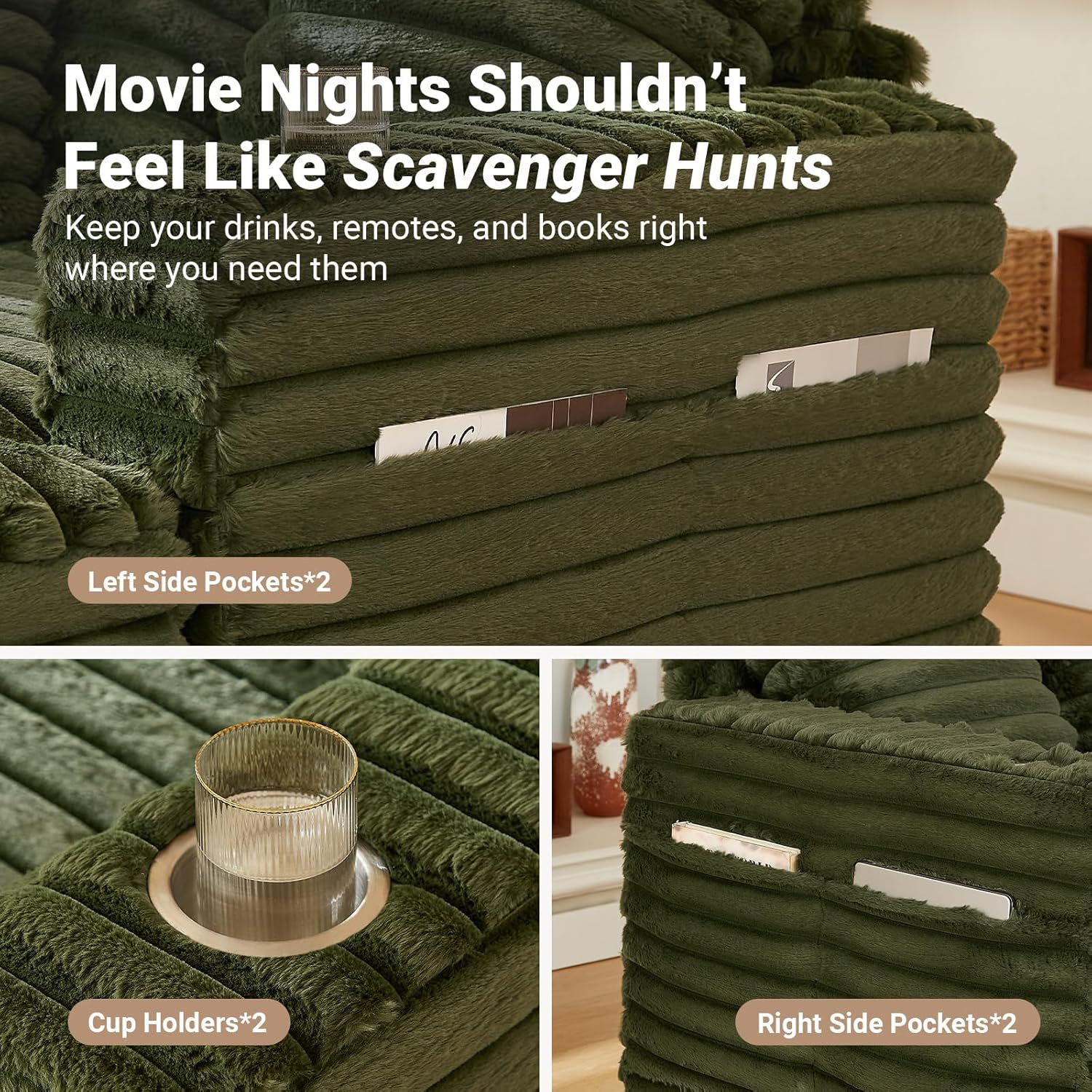 [Built-in Cup Holders & Storage Pocket]: Thoughtfully designed for convenience, each armrest includes an integrated cup holder to keep your drinks, remote, or phone wisthin arms reach, helping to maintain a tidy environment. The side of the chair features two built-in fabric pockets, ideal for storing books, magazines, or a tabletoffering clutter-free relaxation and smarter use of space, ensuring an organized and neat living area.