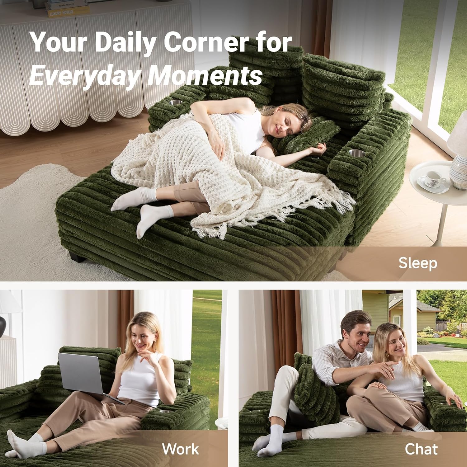 [Extra Wide & Deep Seat, +20% Size]: Designed for full-body comfort, 64" D x 54" W x 33.5" H that allows you to fully stretch out and unwind. Perfect for tall users or anyone who craves extra room, this oversized design transforms your living room, bedroom, or reading corner into a personal relaxation zone. The spacious seat pairs beautifully with the included pillows to support your neck, back, and waist.