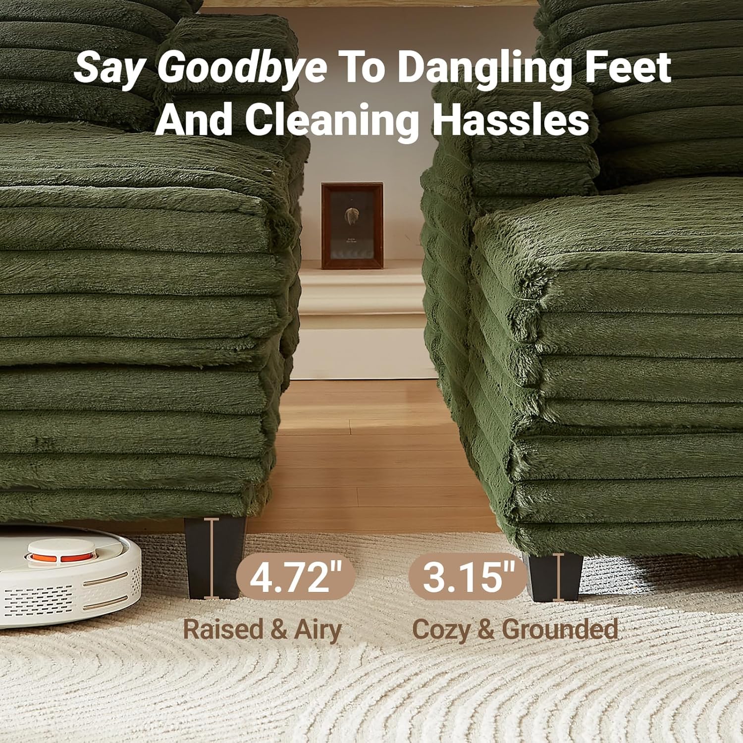 [Two Sets of Sofa Legs]: This oversized chair comes with two sets of interchangeable legs: a 3.15in (8cm) set and a 4.72in(12cm) set, allowing you to customize the height to fit your comfort level and needs. Whether you prefer a lower, lounge-style feel or a higher seat for easy access, this thoughtful design adapts to you. Plus, the 4.72in(12cm) height provides enough clearance for a robotic vacuum, making cleaning underneath effortless.