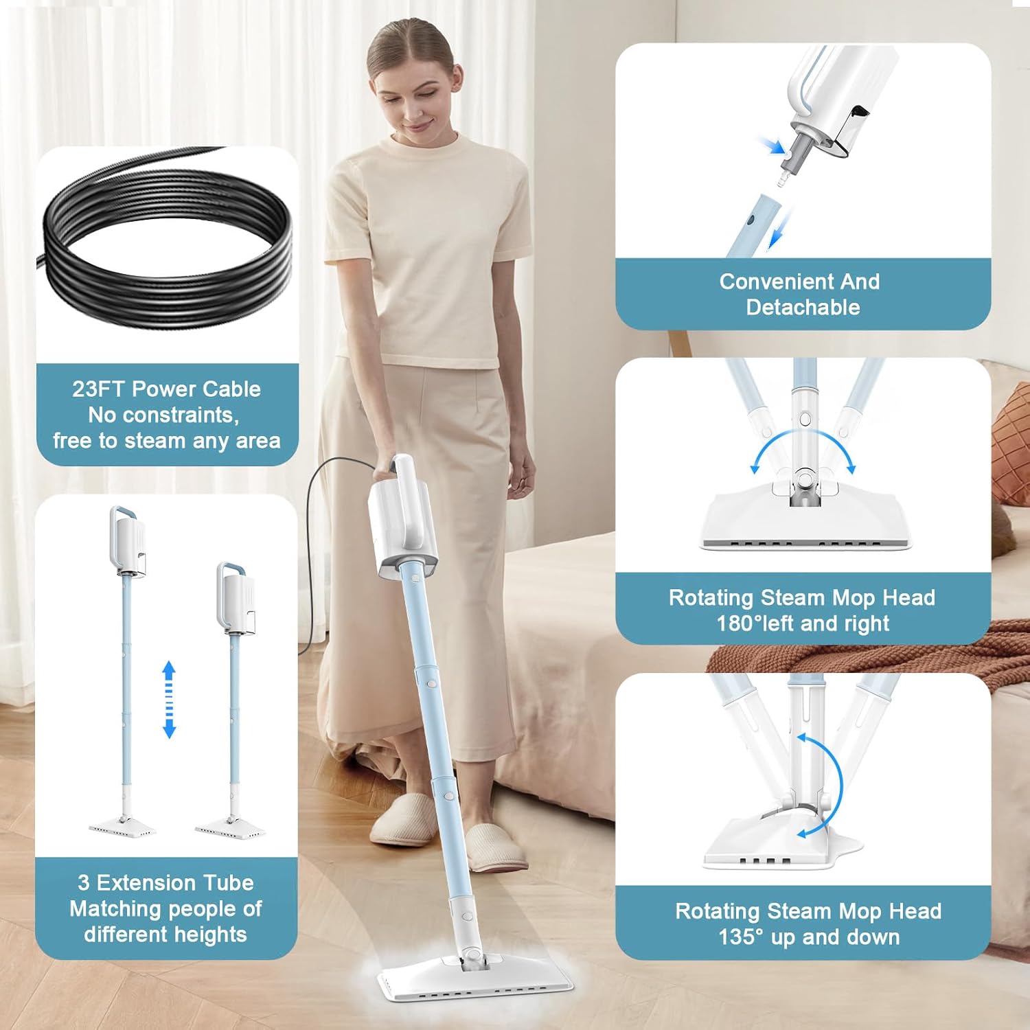 Dual Steam Modes and Effortless Maneuverability Switch between two steam modes to tackle light or heavy-duty messes. The 180 swivel head and 135 vertical pivot allow easy access under furniture and around corners, while the extra-long 23FT power cord offers unrestricted movement across large areas.