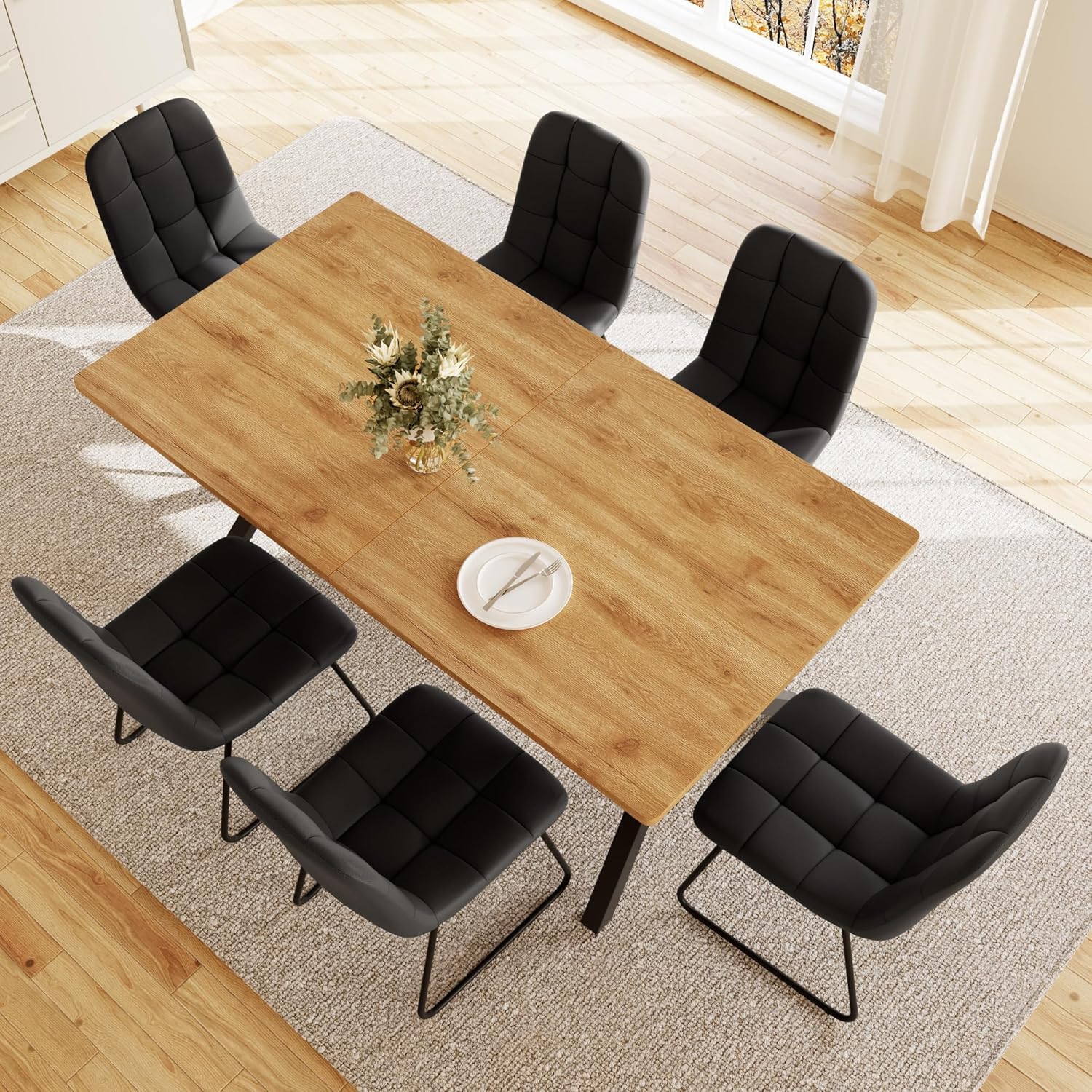 • 7-Piece Dining Table Set for 6 People, 63" MDF Kitchen Table with 6 Upholstered Chairs, Metal Legs for Dining Room, Kitchen(Oak Table+6 U-Shaped Black Chairs)