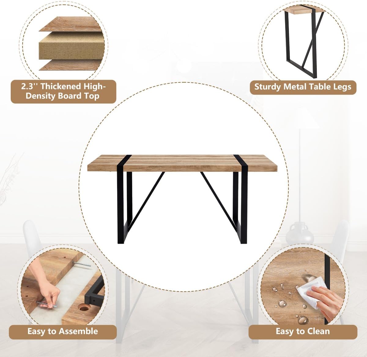[Easy Assembly and Cleaning] : The dining table chairs set detailed assembly instructions are included, making assembly a breezemost individuals can complete the setup within 20 minutes. Additionally, the table surface is protected with a sticker layer, guarding against stains and oil spills, enhancing durability, scratch resistance, and easy cleaning with a gentle wipe of a damp cloth.