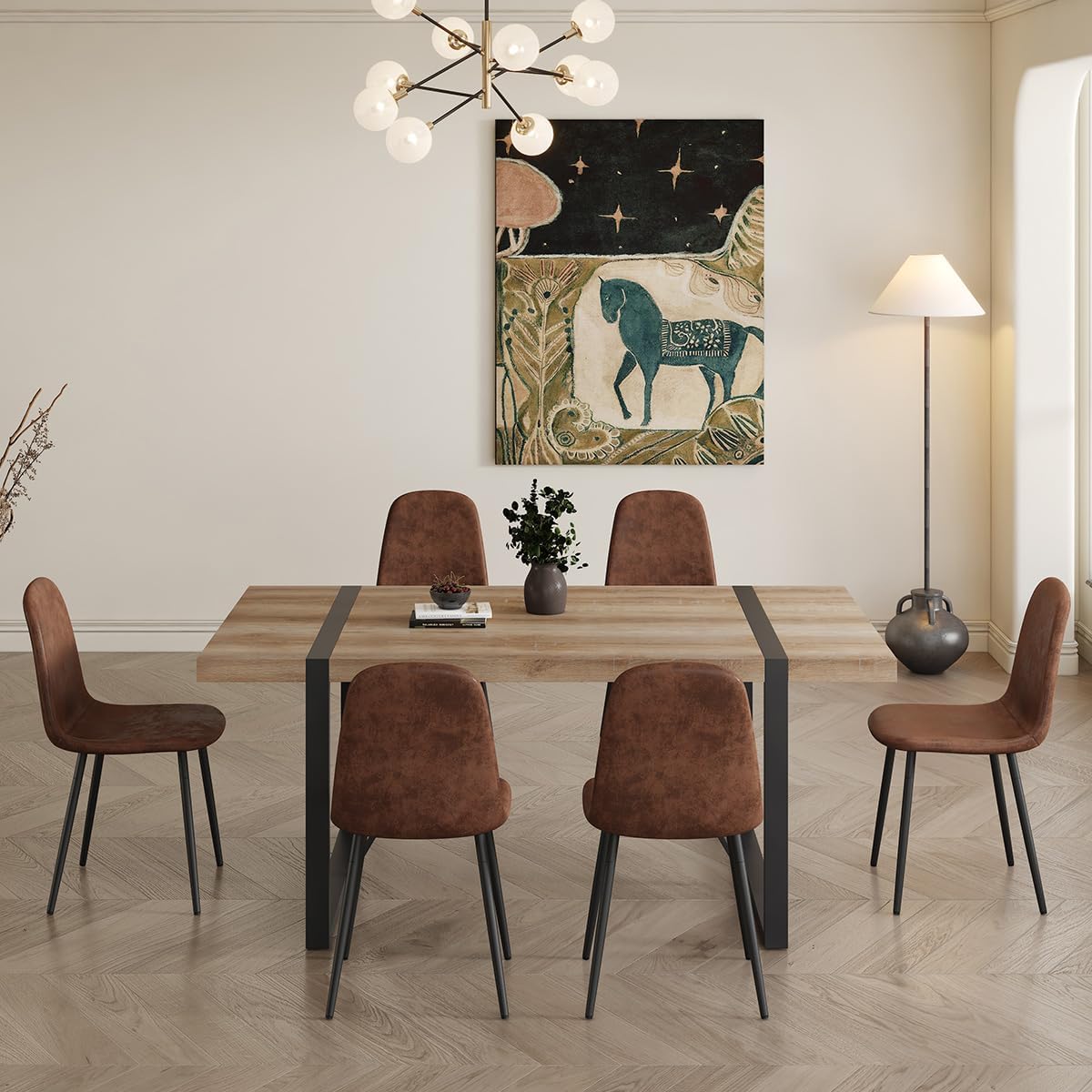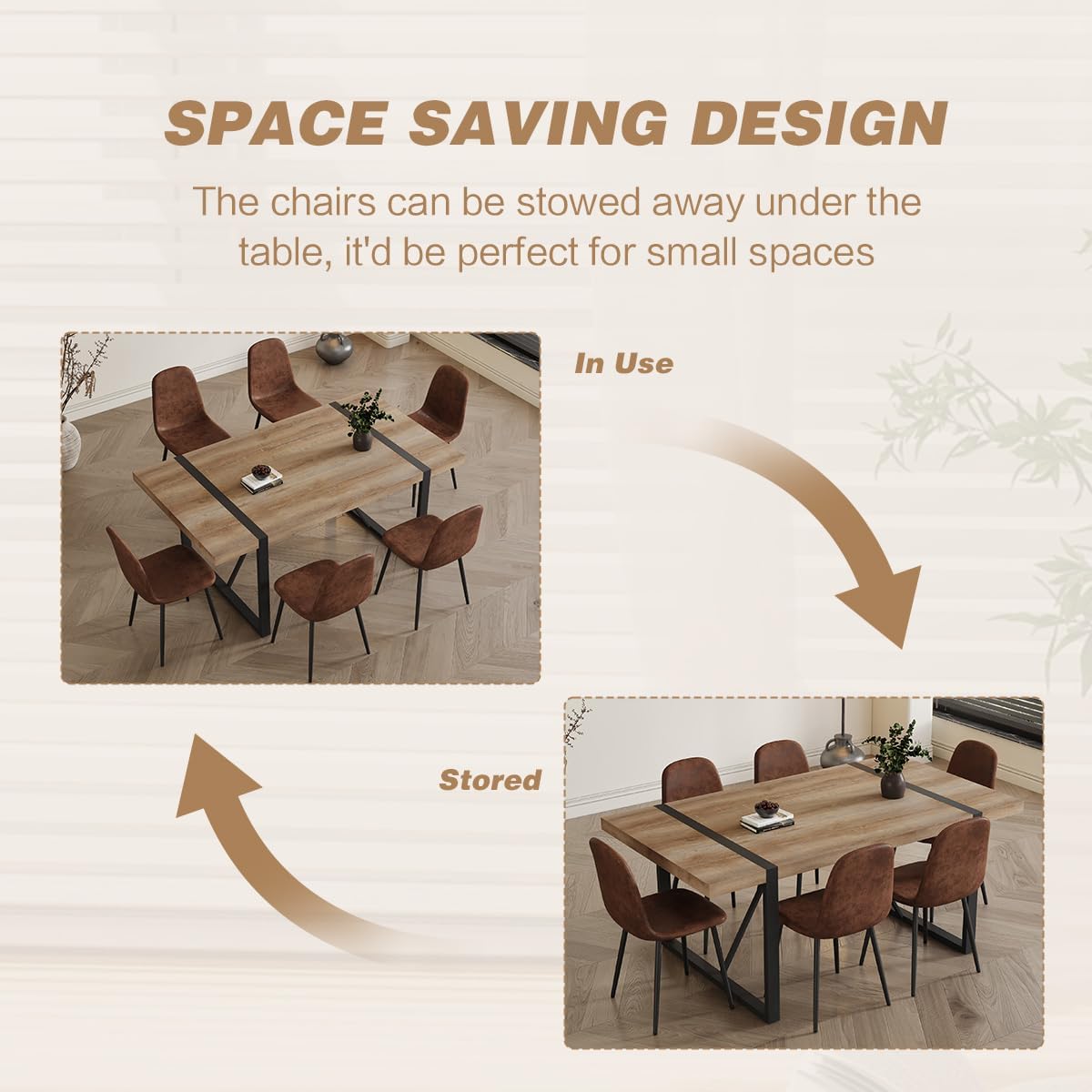 [Space-Saving Design] : The chairs boast comfortable high-density foam cushions and upholstered in breathable suede nap fabric. Occupying only a small area in your home, this 6 person dining table set accommodates your family's dining needs efficiently. After dining, the chairs can be conveniently tucked under the table, saving space and maintaining a neat appearance.