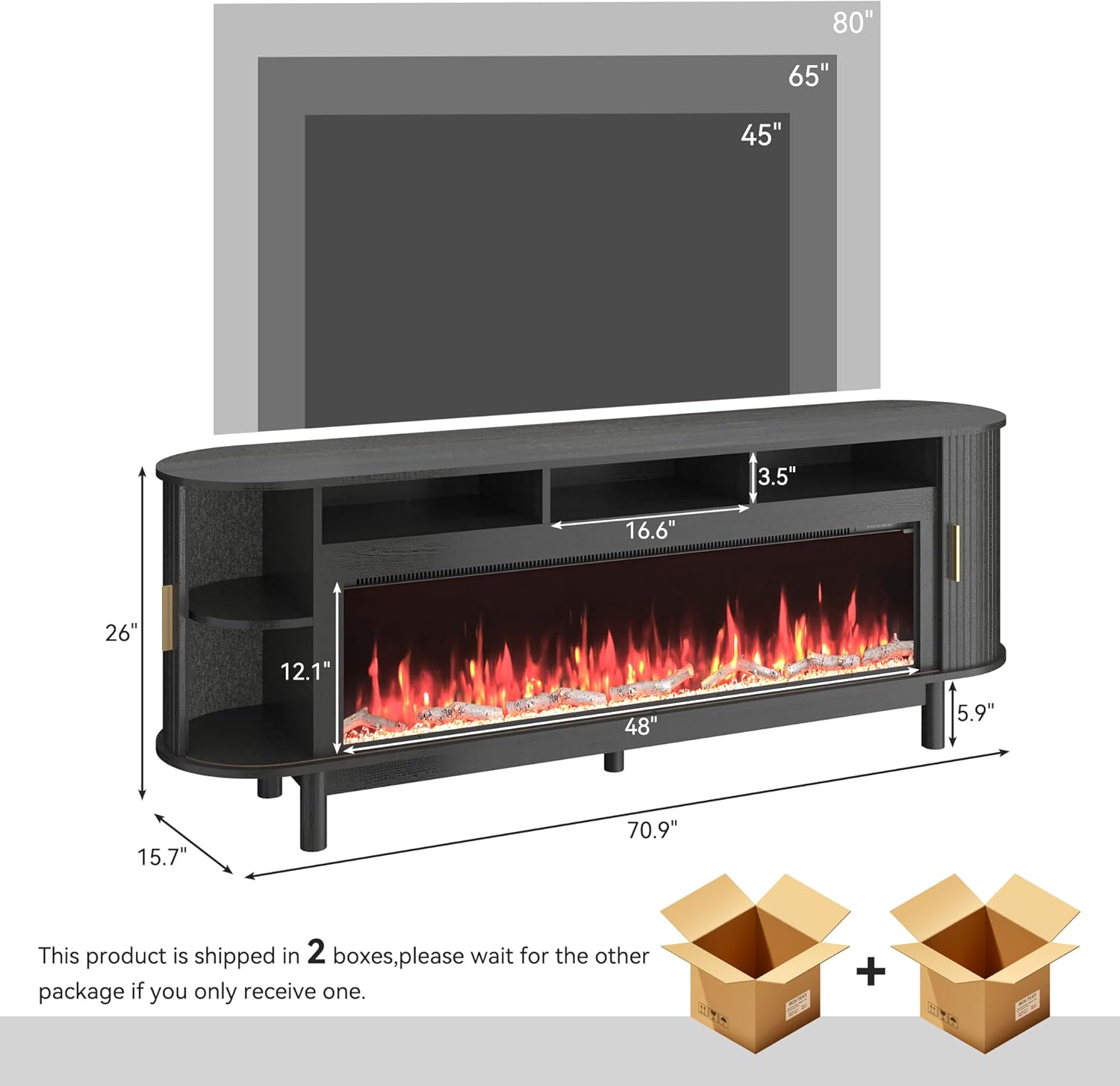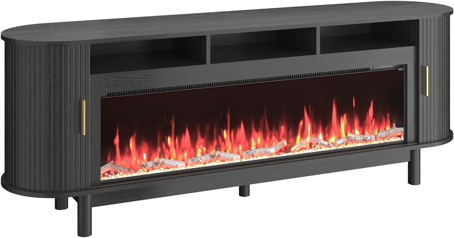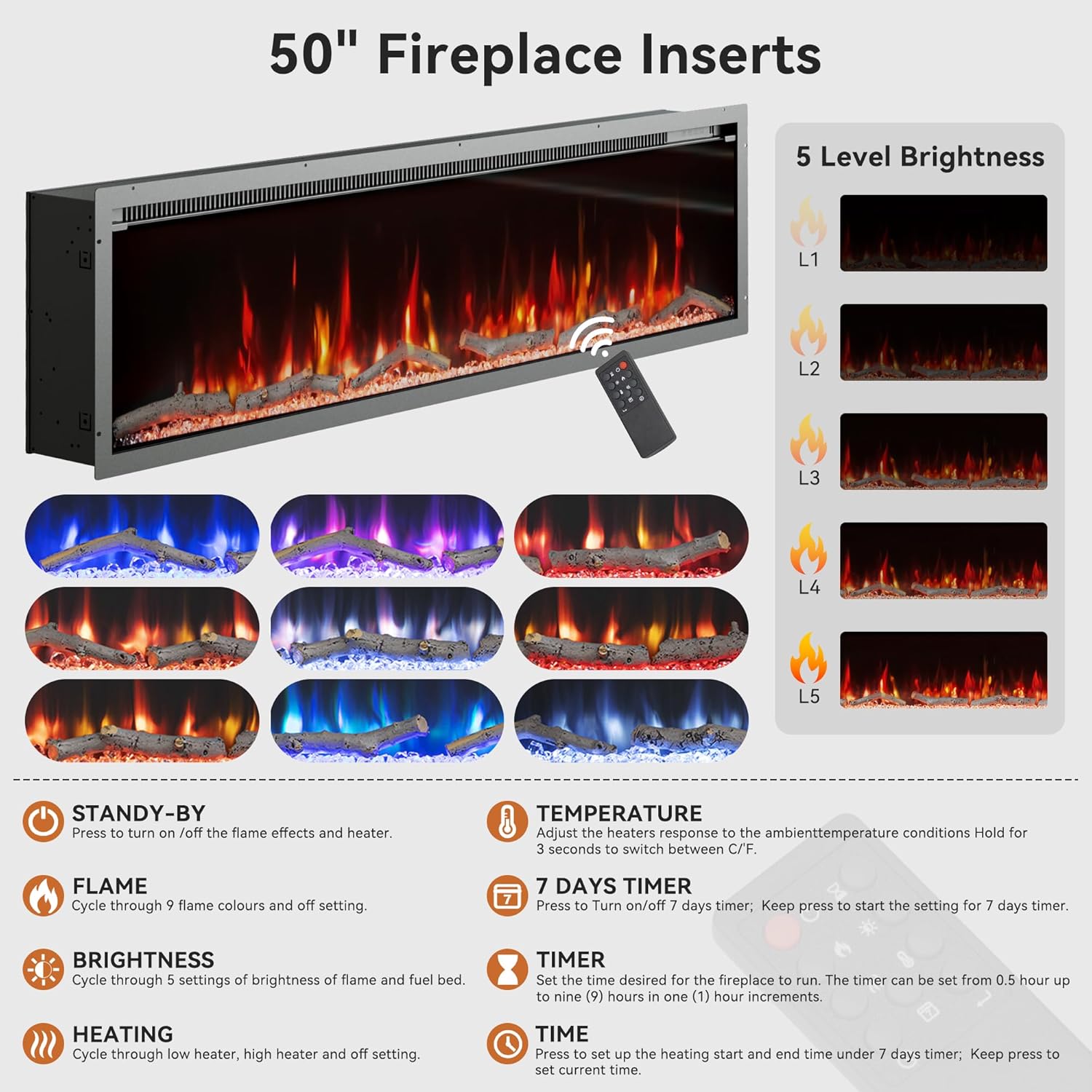 Realistic 50 Electric Fireplace: This electric fireplace tv stand features a stunning 50 inch fireplace insert with adjustable 9 colors and 5 brightness levels. Its temperature ranges from 62 to 82, offering cozy warmth.