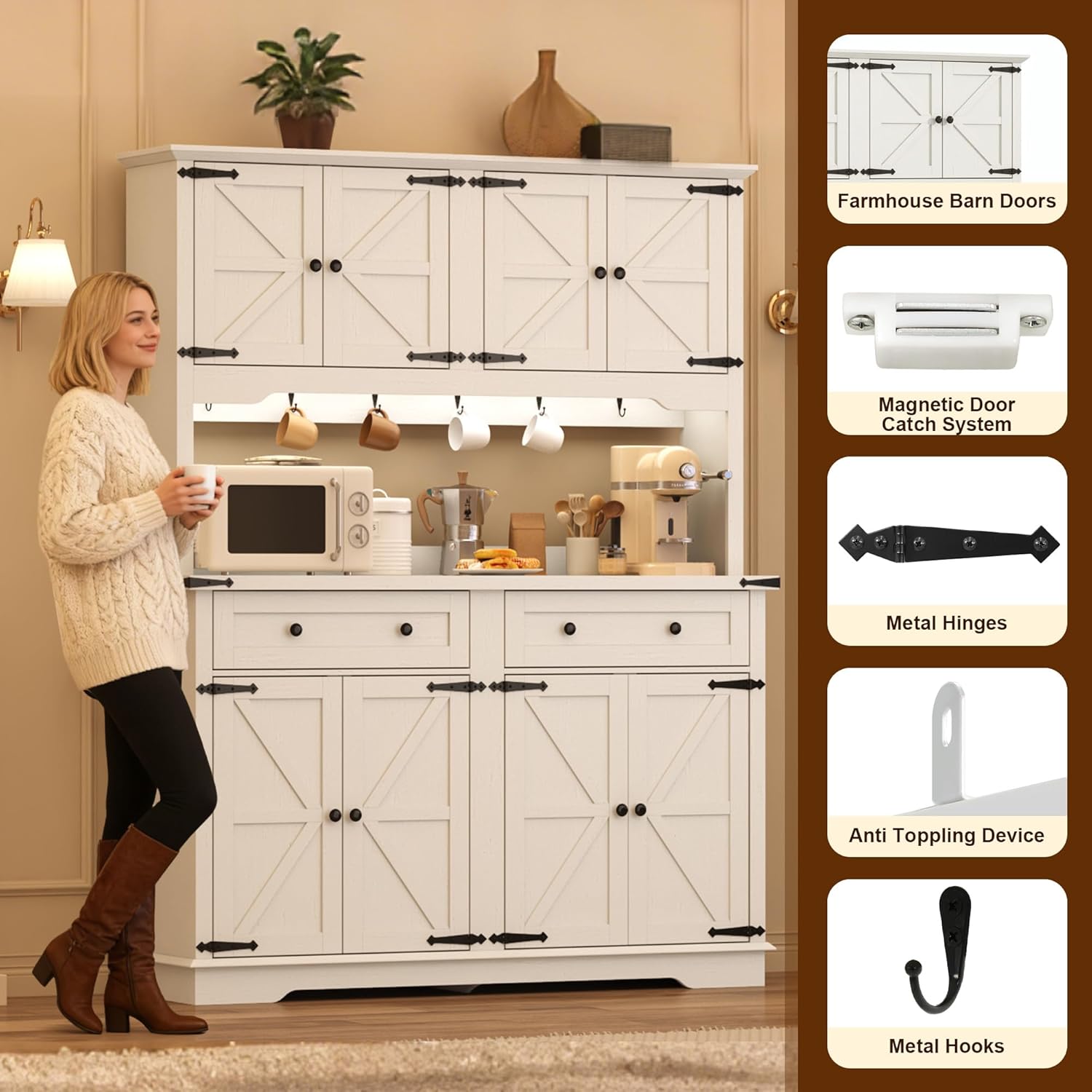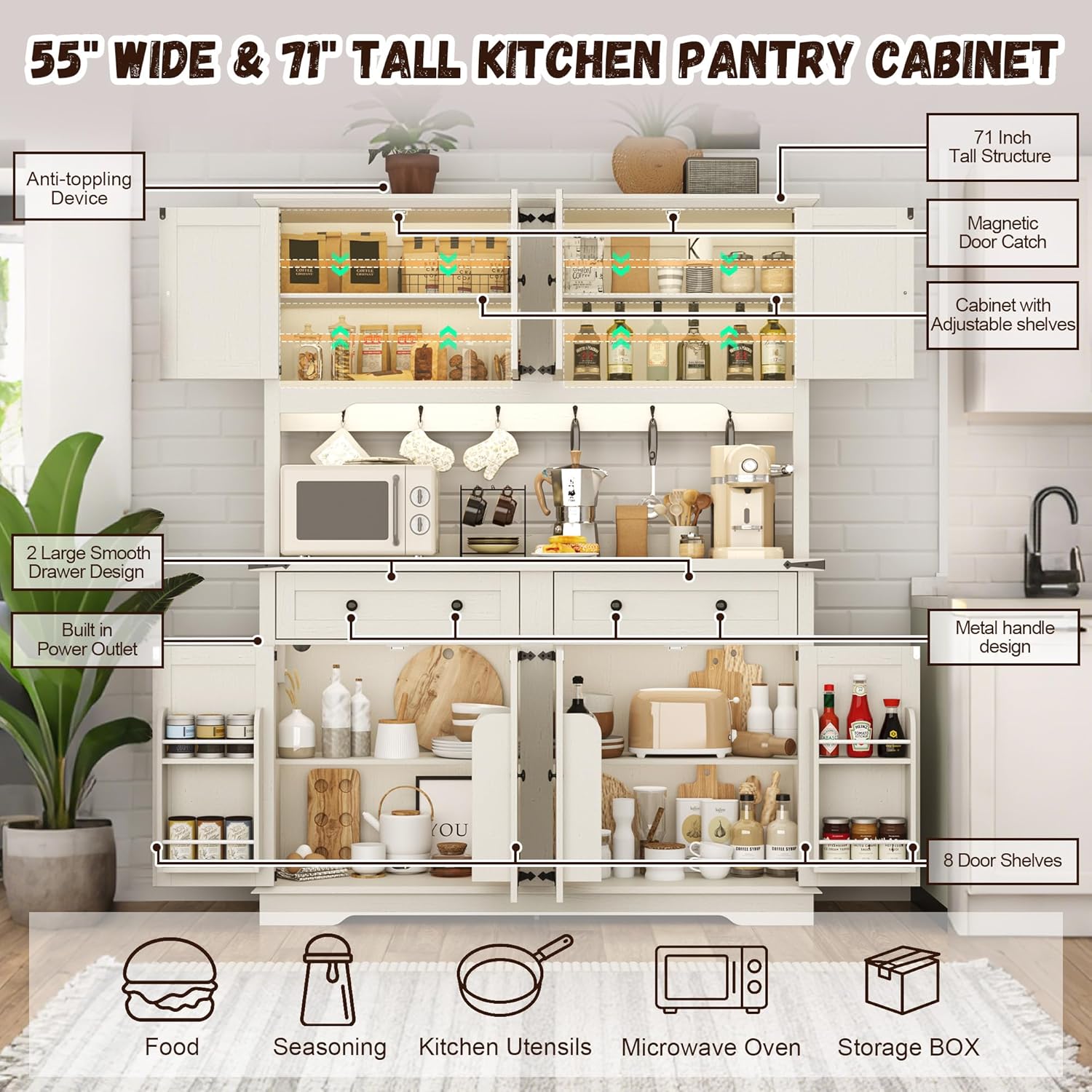 Versatile Countertop : This wooden pantry cabinet features a 55-inch wide, 15.7-inch deep countertop with rated at 11 lbs each for hanging mugs, towels, or cooking accessories. The interior top cabinet features adjustable shelves, allowing you to customize storage heights. It easily accommodates spice jars, cutlery, large pots, and various sizes of wine bottles, sauces, and beverages. Standing 71 inches tall, this kitchen hutch storage cabinet boasts an ergonomic countertop height for comfortable daily use. Its ideal 35-inch operating height lets you effortlessly access appliances without bending or straining