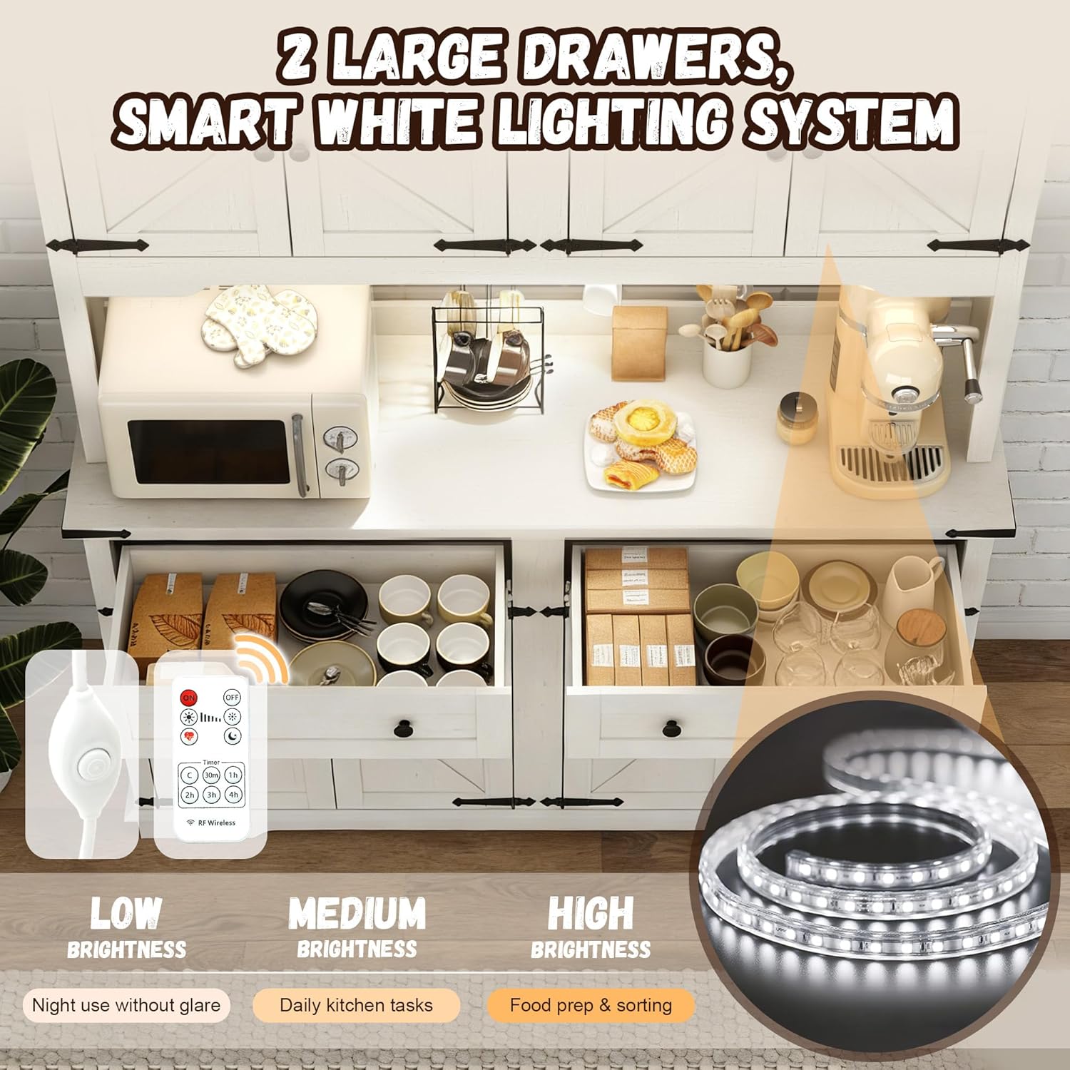Farmhouse-Style Storage Cabinet with Power Lighting: This 71-inch tall pantry cabinet blends classic farmhouse style with modern smart features. It includes two standard AC power outlets and two USB ports for quick charging of everyday appliances like coffee makers, microwaves, or toasters. Equipped with smart white LED lighting strips, its thoughtful design completely solves the problem of upper cabinet shadowing, making it easy to retrieve items even in nighttime kitchen environments