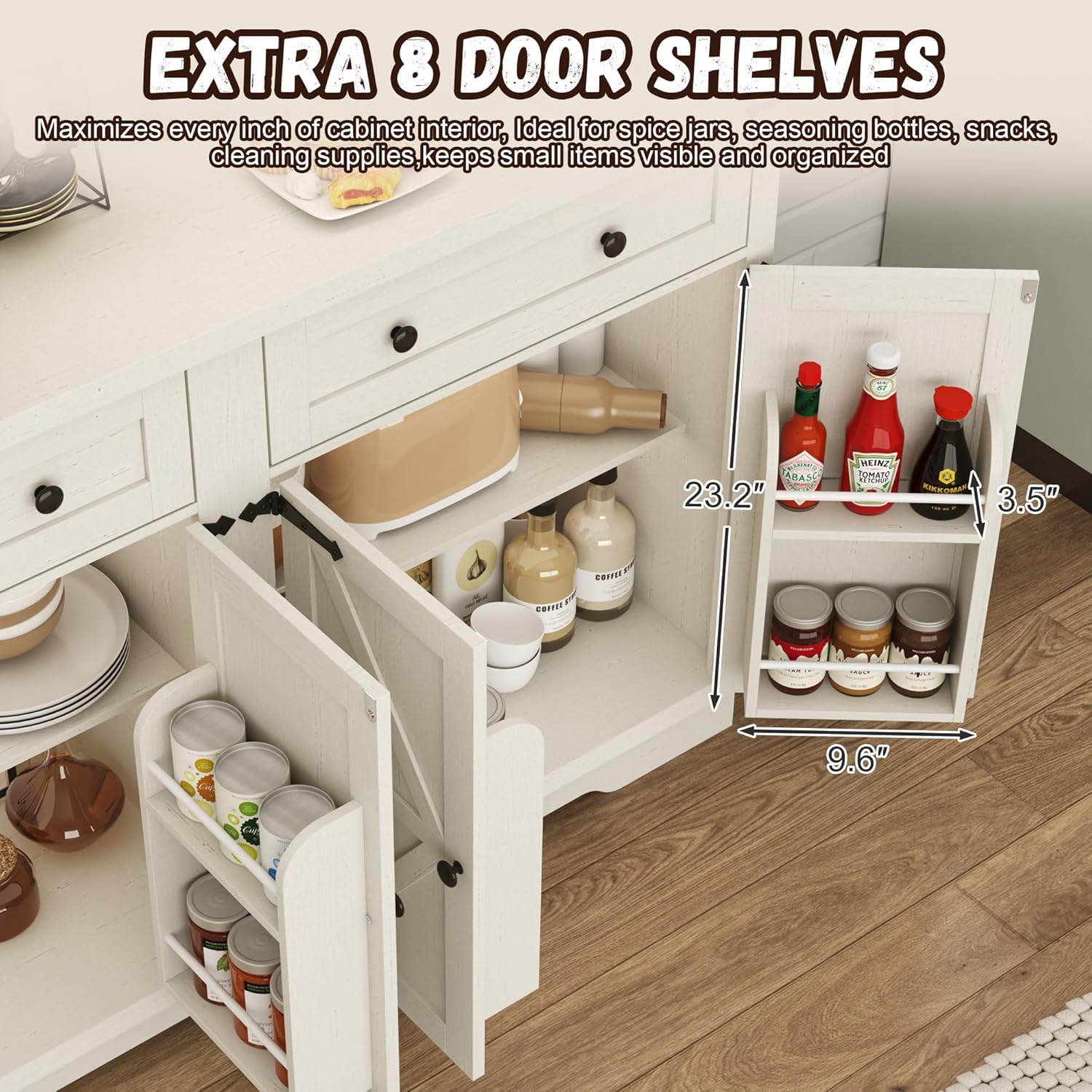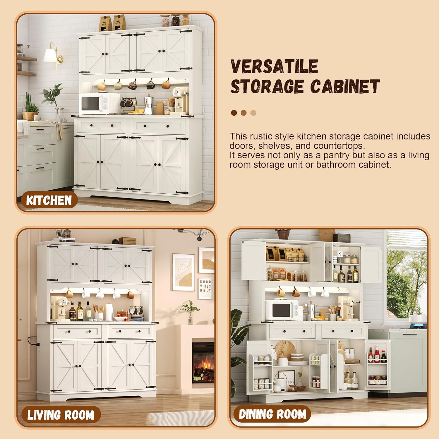 Rustic Aesthetics Meets Modern Functionality: Featuring an antique wood grain finish, vintage metal handles, and a rustic barn door, this pantry cabinet blends rugged charm with contemporary, farmhouse, country, or vintage kitchen styles. Its versatile design serves as a kitchen hutch storage cabinet, living room coffee bar, office snack pantry, coffee corner, living room storage unit, or bathroom cabinet. This large wooden rustic storage cabinet is the ideal choice