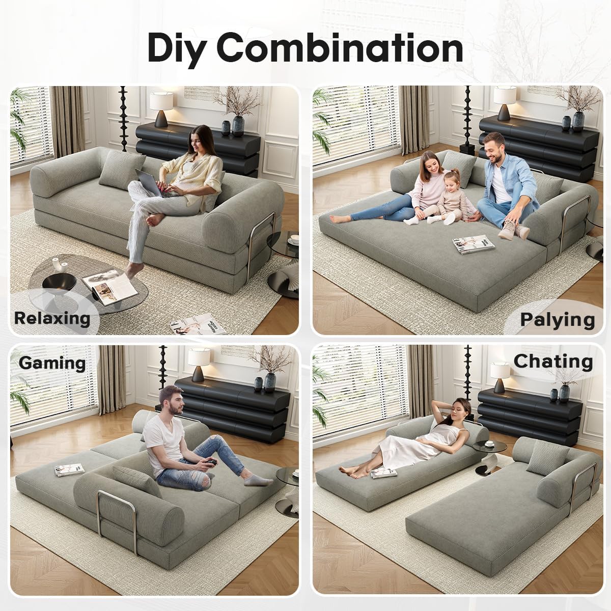 DIY Modular Sofa Design:Unleash your creativity with this corduroy folding mattress sofa. You can arrange this sofa in four different layouts: a compact double seat, a multi-person lounge chair, a play area, or a flatbed. Redefine your space every day to suit your mood or occasion.