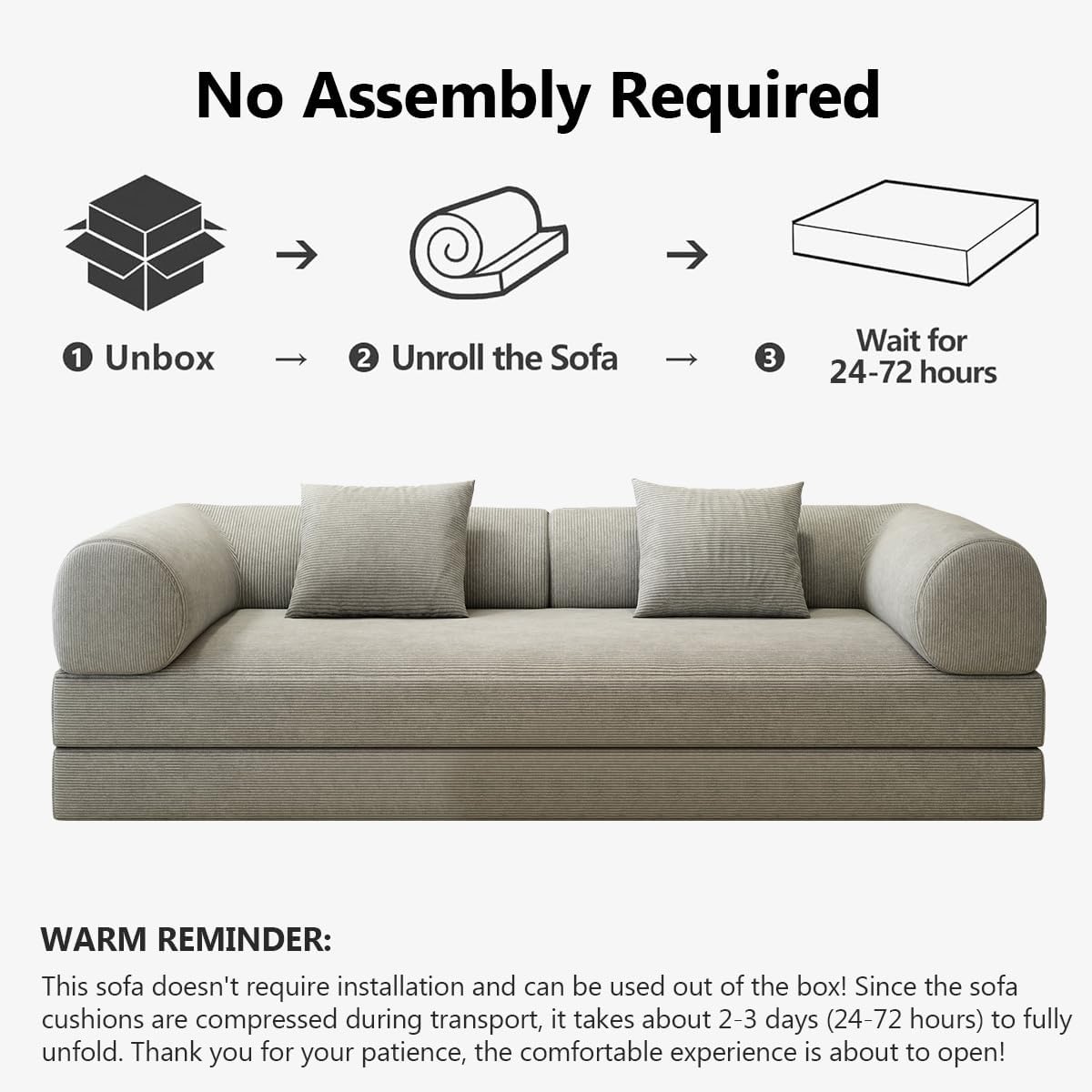 No Assembly RequiredNo complicated installation needed! This corduroy compression sofa bed is fully formed - simply open the box, put it in place and watch it expand to perfect fluffiness. No tools, no trouble - just relax immediately within 72 hours.