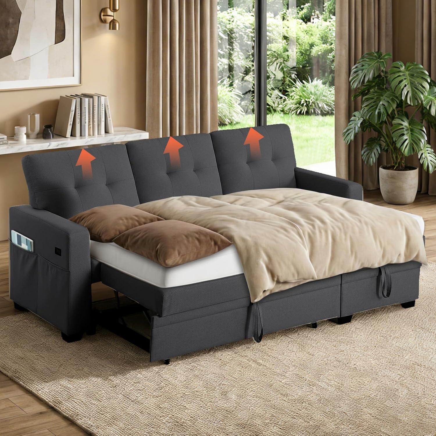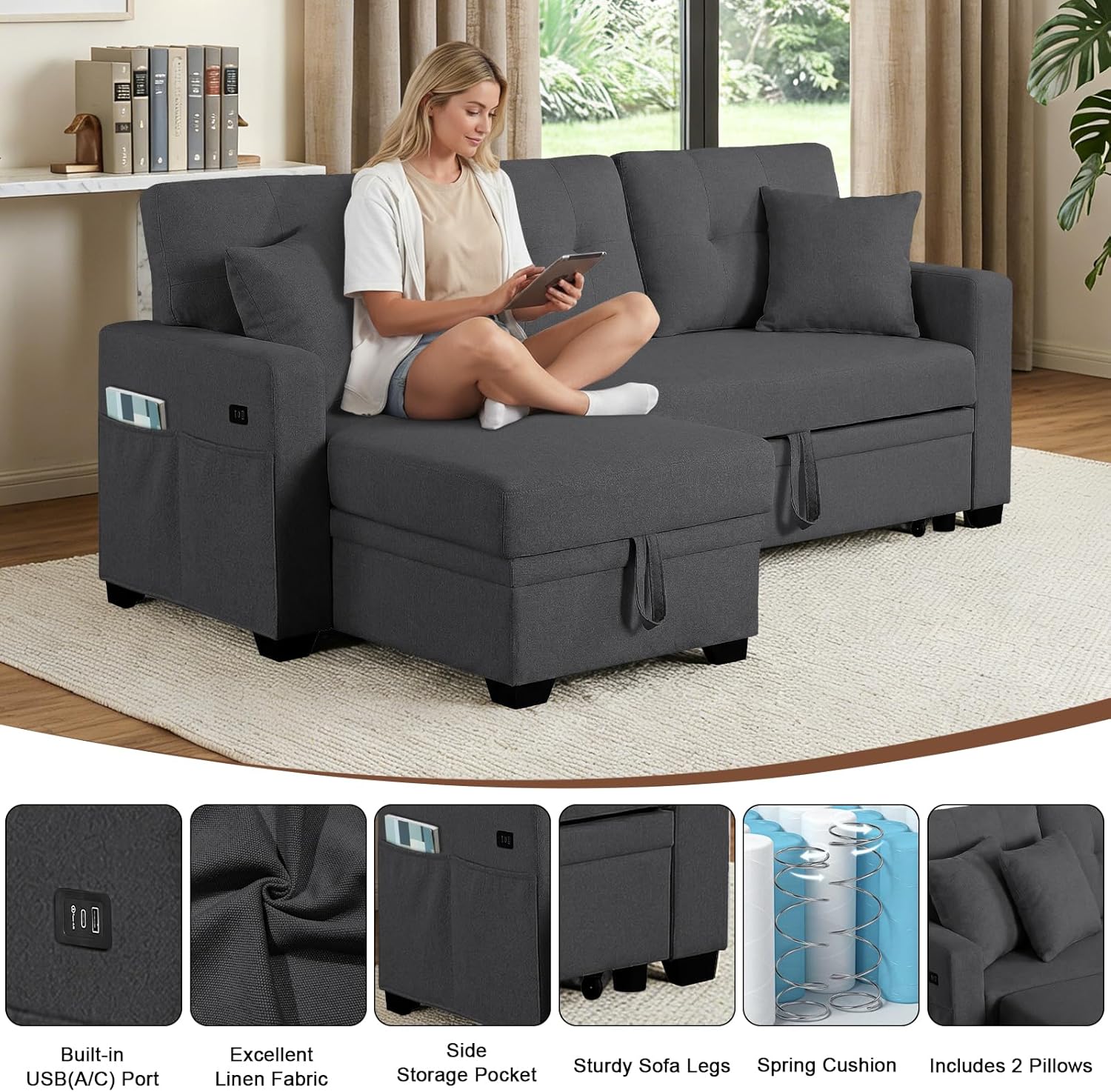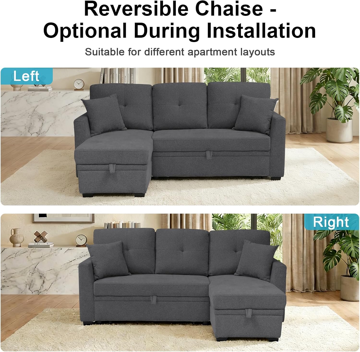 Ample Storage: This sleeper sofa includes a hidden compartment under the chaise for storing pillows, blankets, and essentials. Side pockets keep items organized, and an included throw pillow adds comfort