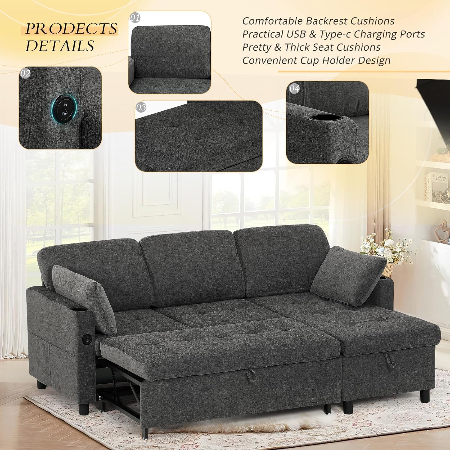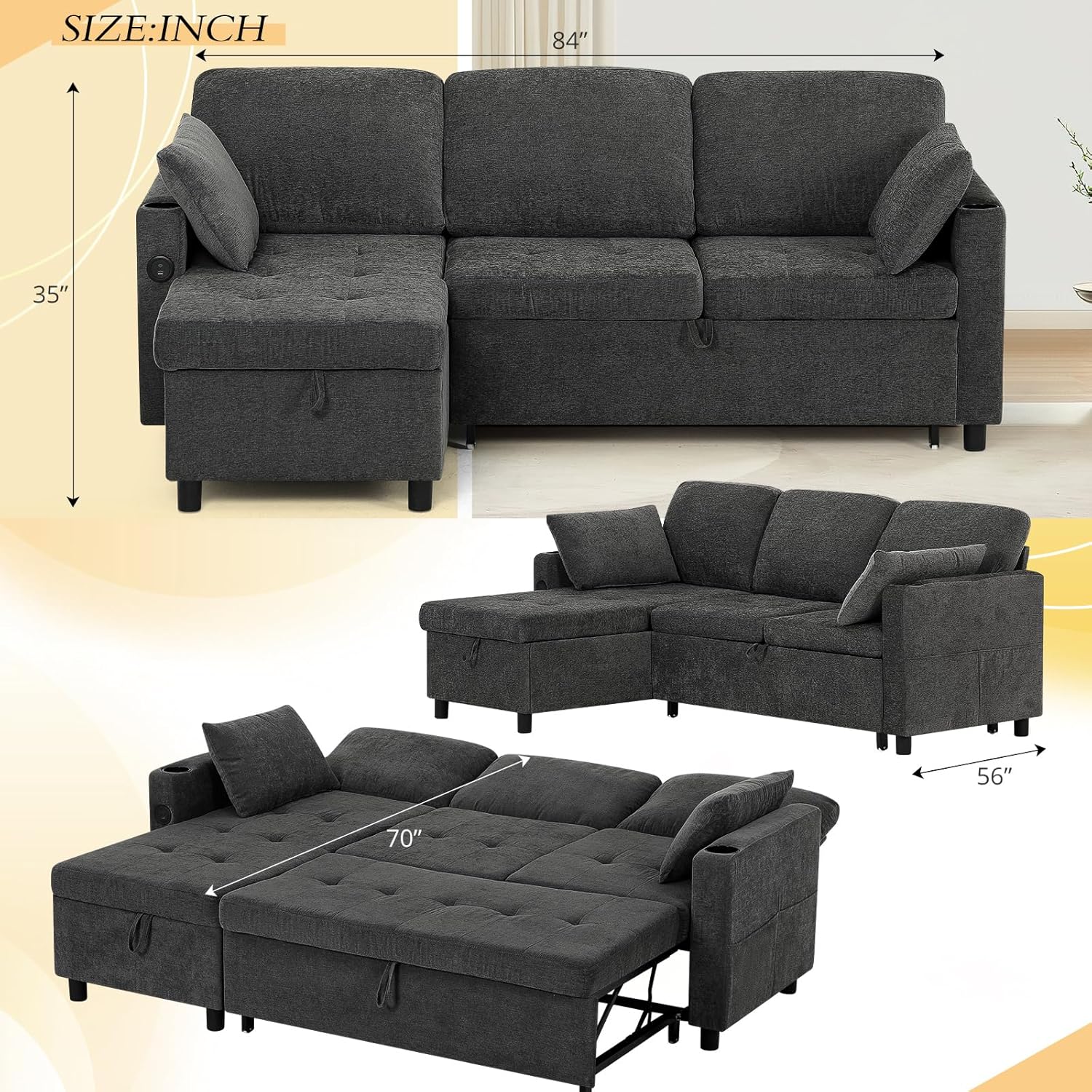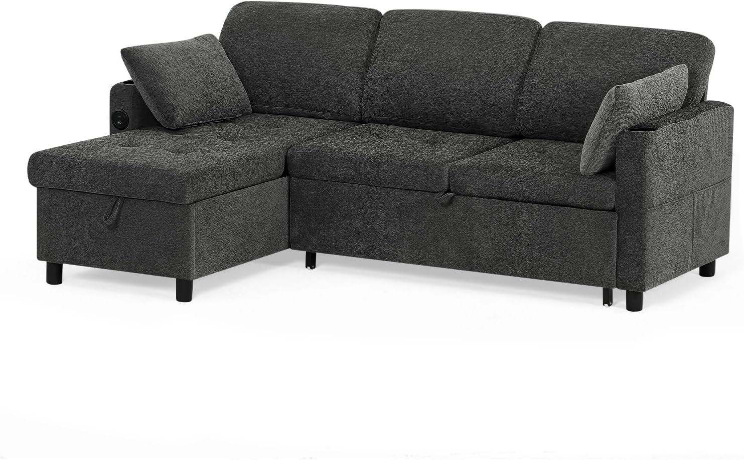 POCKETS & STORAGE CHAISE: This pull out sofa bed has a storage chaise. Not only can you store out-of-season clothes, but you can also assemble this chaise on the right or left side of the sofa according to your space layout