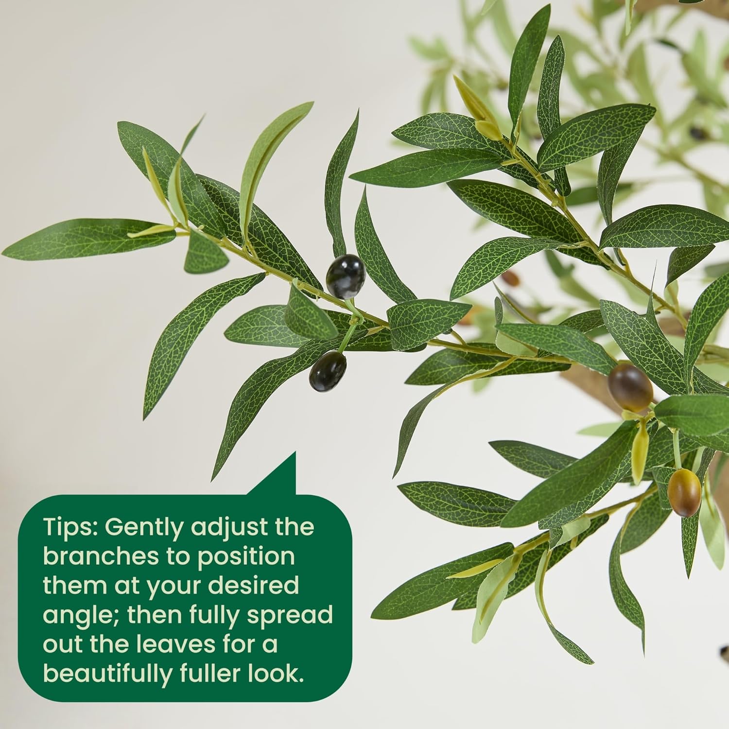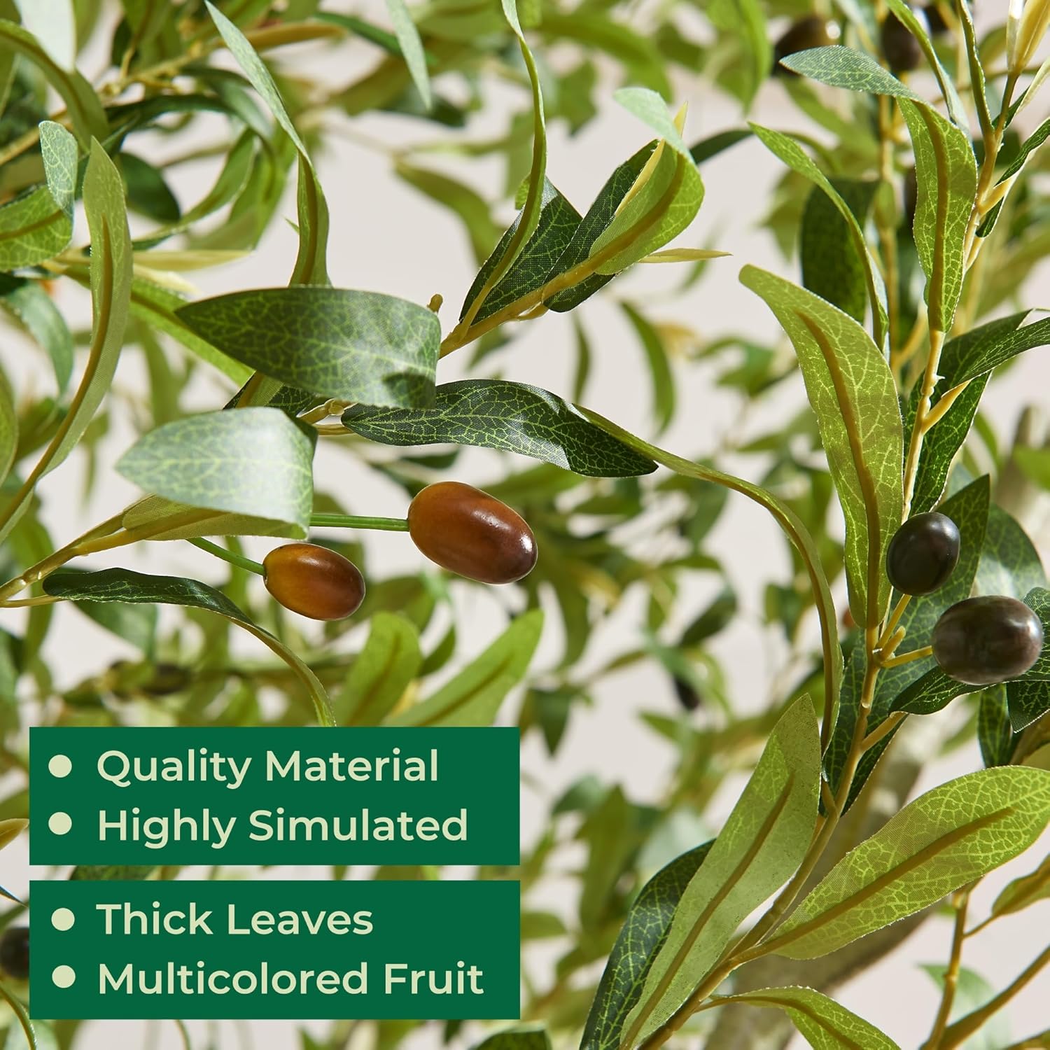 Ultra-Realistic Aesthetic: Crafted with detailed attention to nature's artistry, our faux olive tree boasts true-to-life texture, rich color variations, and realistic synthetic olives. The leaves shimmer naturally under light, enhancing depth and vibrancy. This lifelike appearance creates an inviting, organic ambiance, fooling the eye and bringing a touch of serene, outdoor beauty indoors.