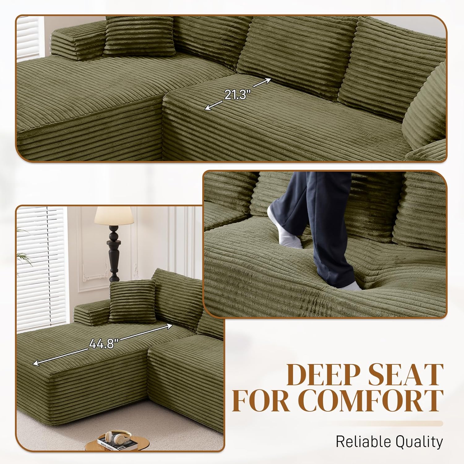 Plush Corduroy Couch Sectioanal: Our compressed sofa set is wrapped in premium corduroy, giving you unrivaled softness and warmth. The upgraded material offers better breathability and stain resistance, making the fluffy couch easy to care for and clean. The unique texture and soft sheen make it stand out, providing gentle pampering no matter the season