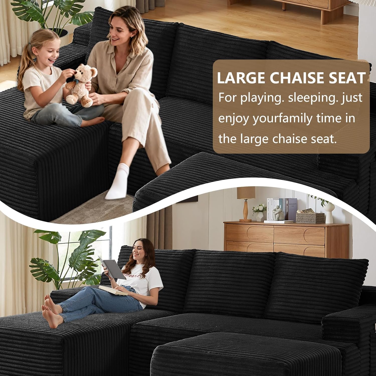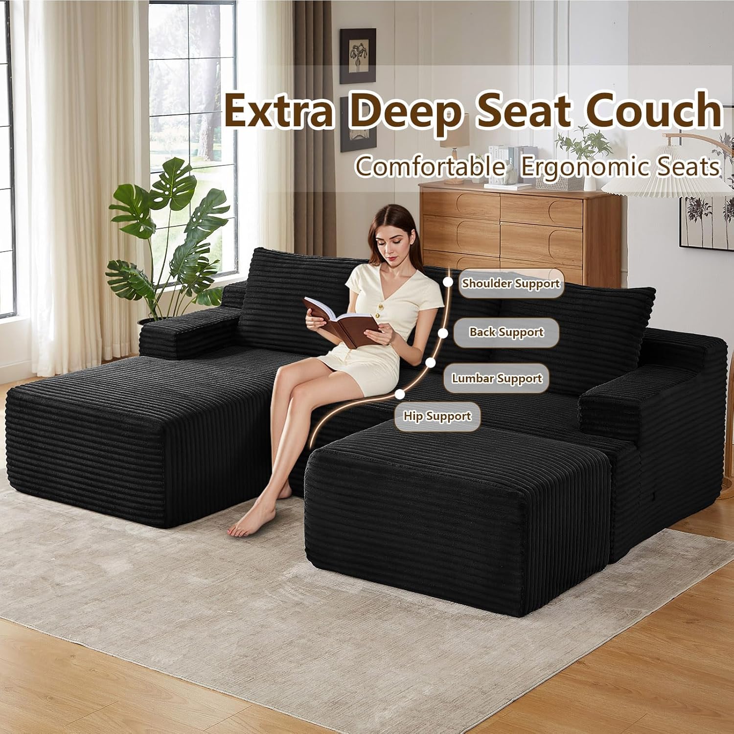 Cloud-Like Comfort:Enjoy oversized comfort with a roomy chaise longue, deep seat, and matching ottoman. Filled with high-resilience foam and premium springs, it offers a cloud-like sitting/lying experience. Ideal for family gatherings, couples, or solo relaxationyour go-to spot for comfort.