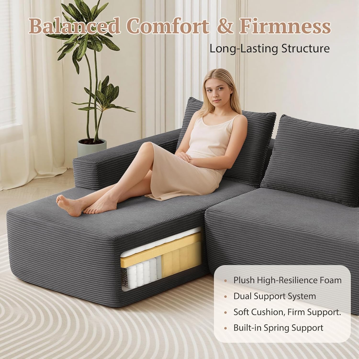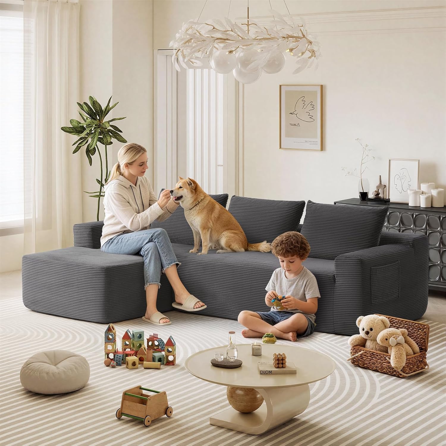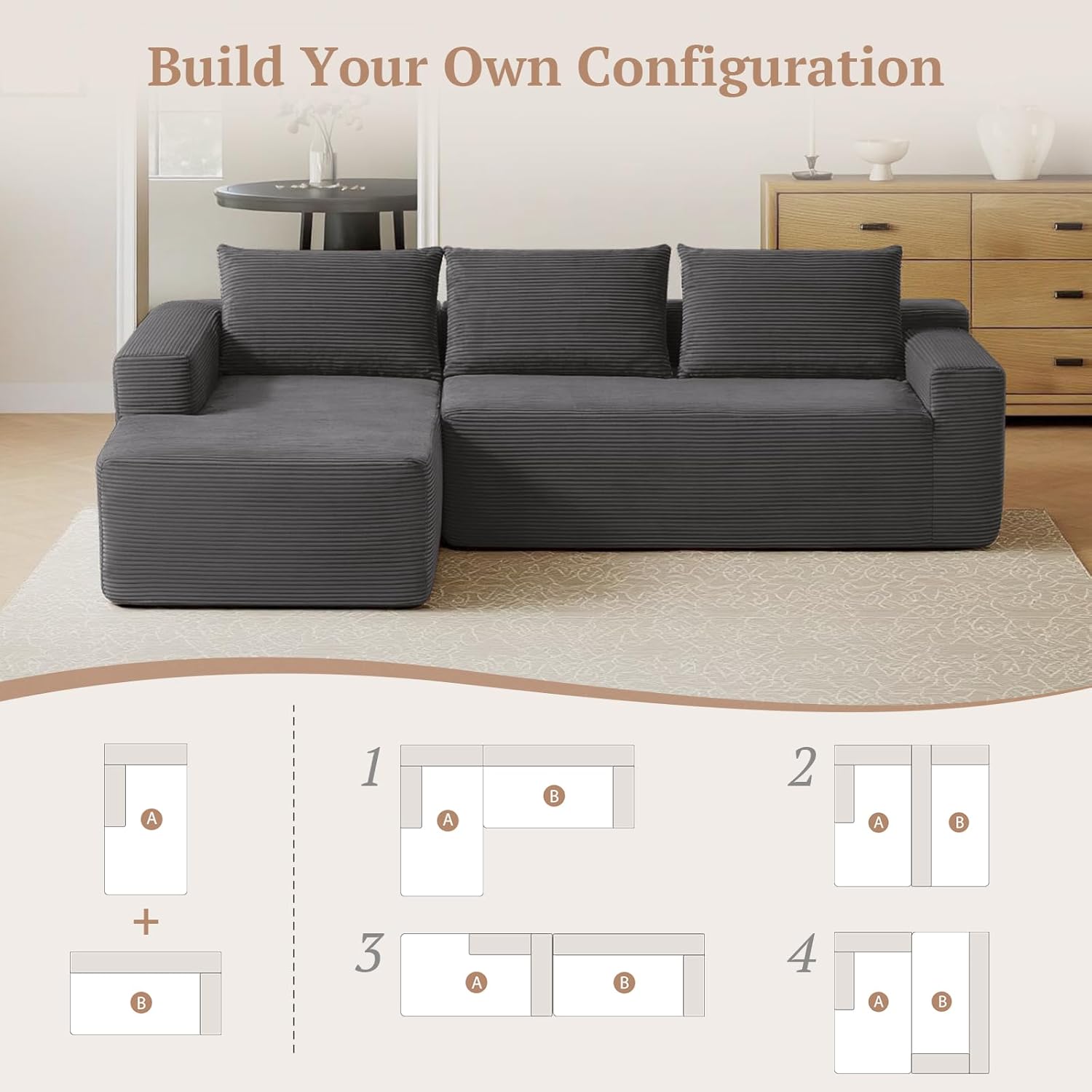 • 97inch Boneless L-Shaped Sectional Sofa with Throw Pillow & Side Pockets- No Assembly Compressed Modular Couch, Memory Foam, Deep Seat for Living Room, Bedroom, Apartment Grey Left