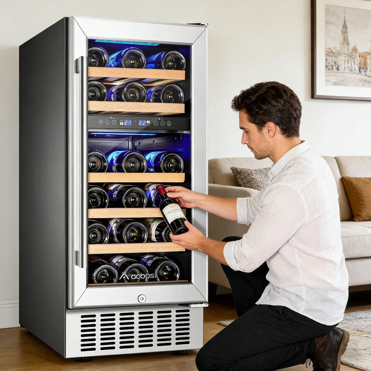 Powerful & Quiet Performance dual-zone wine cooler is equipped with an upgraded compressor and the exclusive shock absorption system, which not only maintains a stable ideal temperature for your wines but also effectively reduces vibration and noise during operation. Operating at below 42dB, the 15-inch wine cooler refrigerator delivers library-like quietness. Suitable for built-in, under-counter, or freestanding installation, it fits perfectly in restaurants, bars, kitchens, and other scenarios.