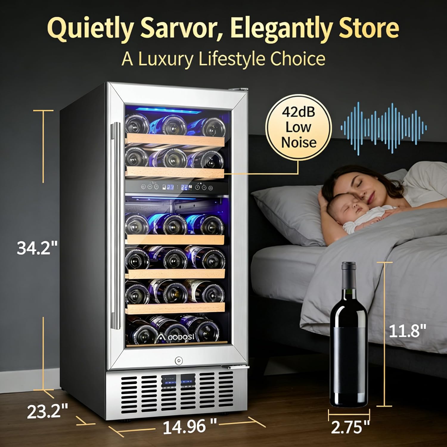 Powerful & Quiet Performance dual-zone wine cooler is equipped with an upgraded compressor and the exclusive shock absorption system, which not only maintains a stable ideal temperature for your wines but also effectively reduces vibration and noise during operation. Operating at below 42dB, the 15-inch wine cooler refrigerator delivers library-like quietness. Suitable for built-in, under-counter, or freestanding installation, it fits perfectly in restaurants, bars, kitchens, and other scenarios.