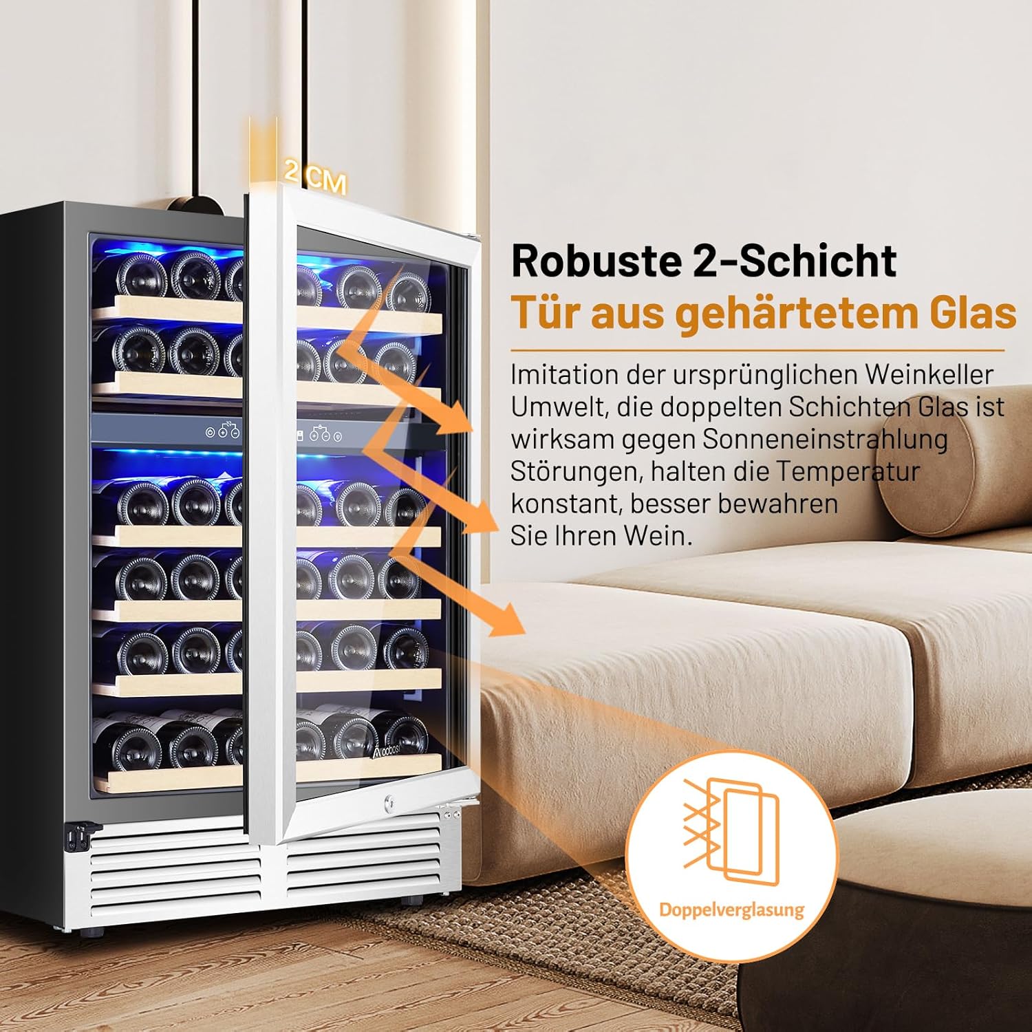 Double Glazing for UV Defence wine refrigerator has a two-pane glass door, which means the design protects your wine from outside UV rays and temperatures while providing a long-lasting and stable storage environment for your wine. This will also make the wine cooler look more upscale, stylish and enhance the aesthetics of the unit.
