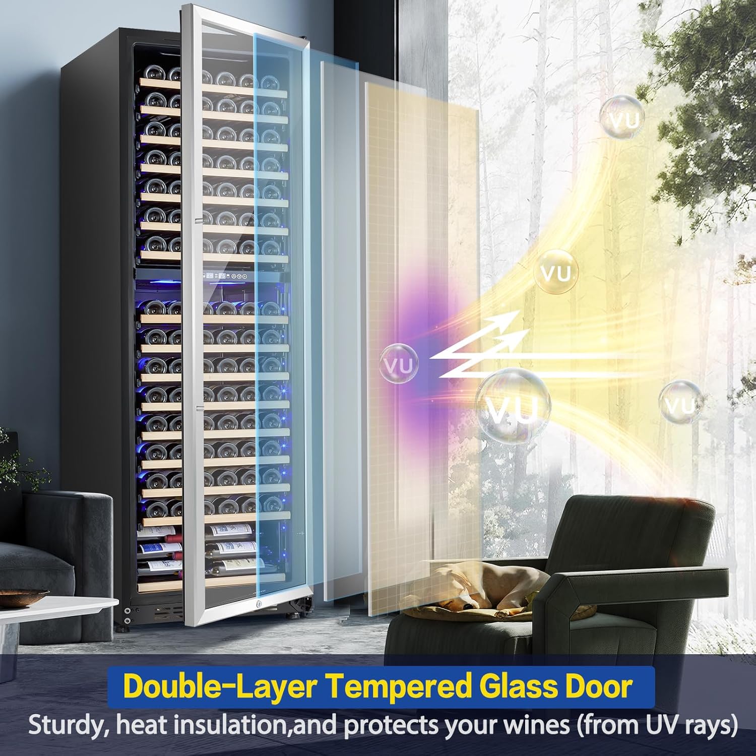 • Wine Cooler Refridgerator 24 Inch, 176 Bottles Dual Zone Wine Fridge with Double-Layer Tempered Glass Door and Temperature Memory Fuction,Built-in or Freestanding.