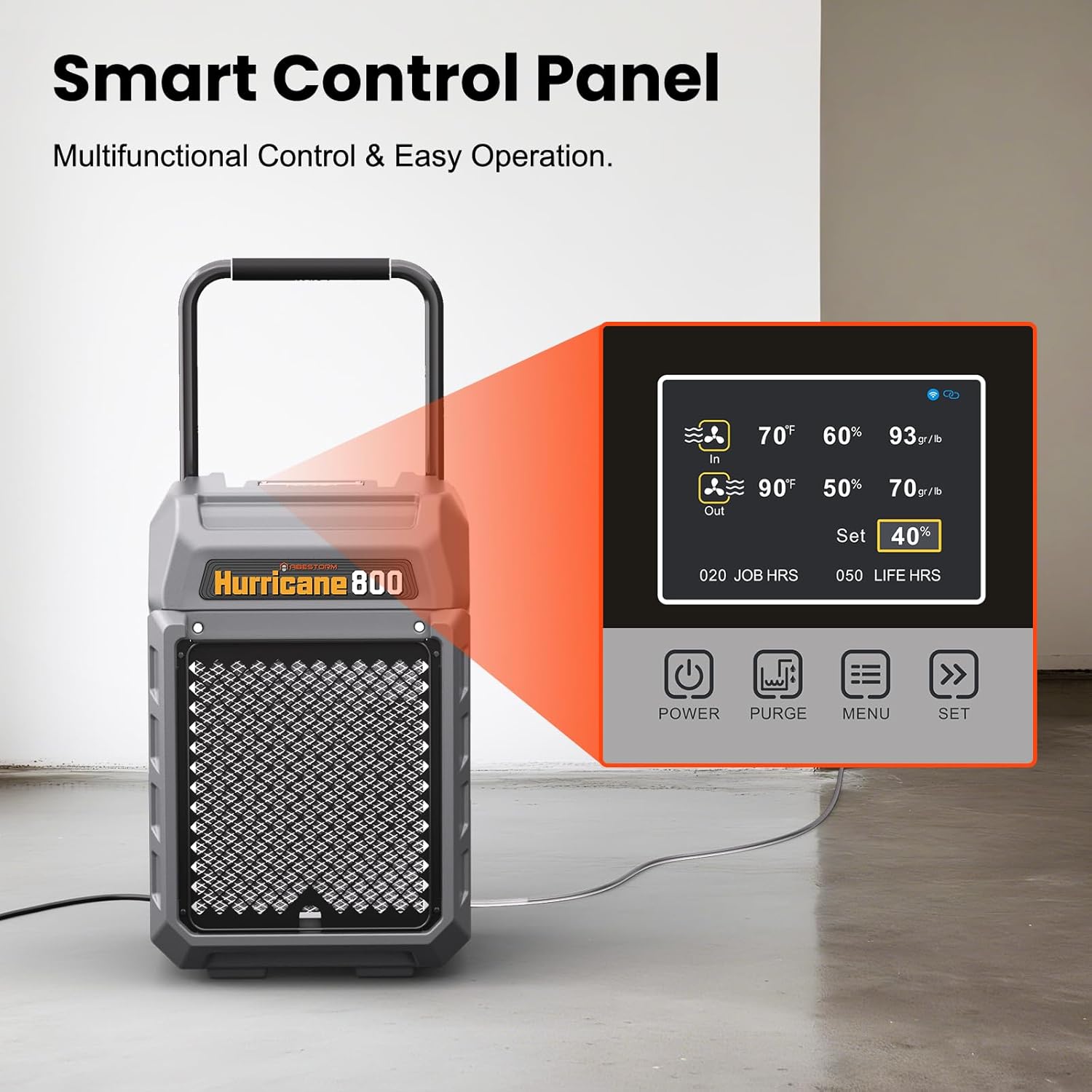 Smart Control SystemThis commercial dehumidifier featuring an intuitive LCD control panel with auto-humidistat, memory function, and automatic defrost, just a few buttons to get any job done. The dual-side temperature/humidity monitoring (inlet/outlet) ensures precise environmental control for professional water damage restoration projects.