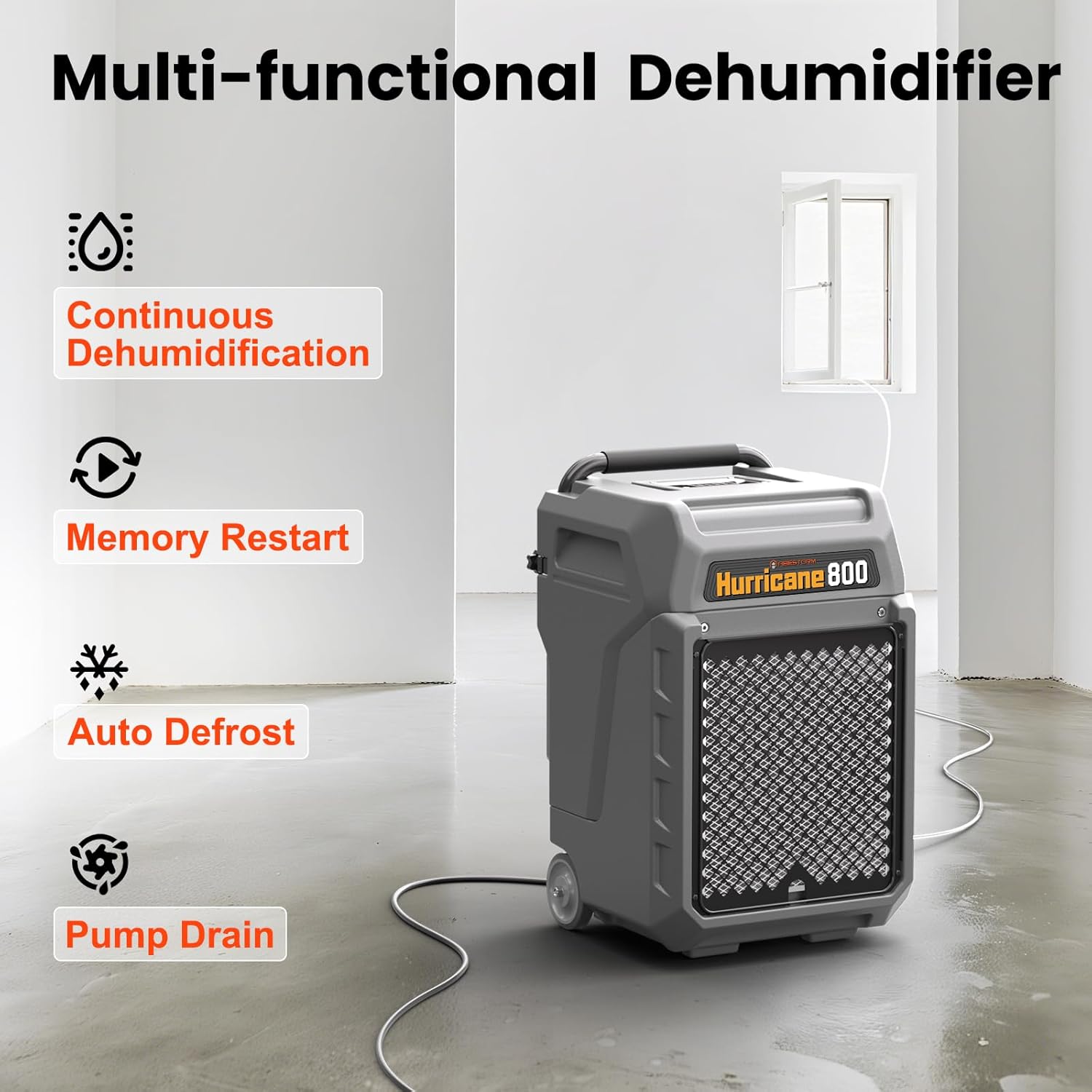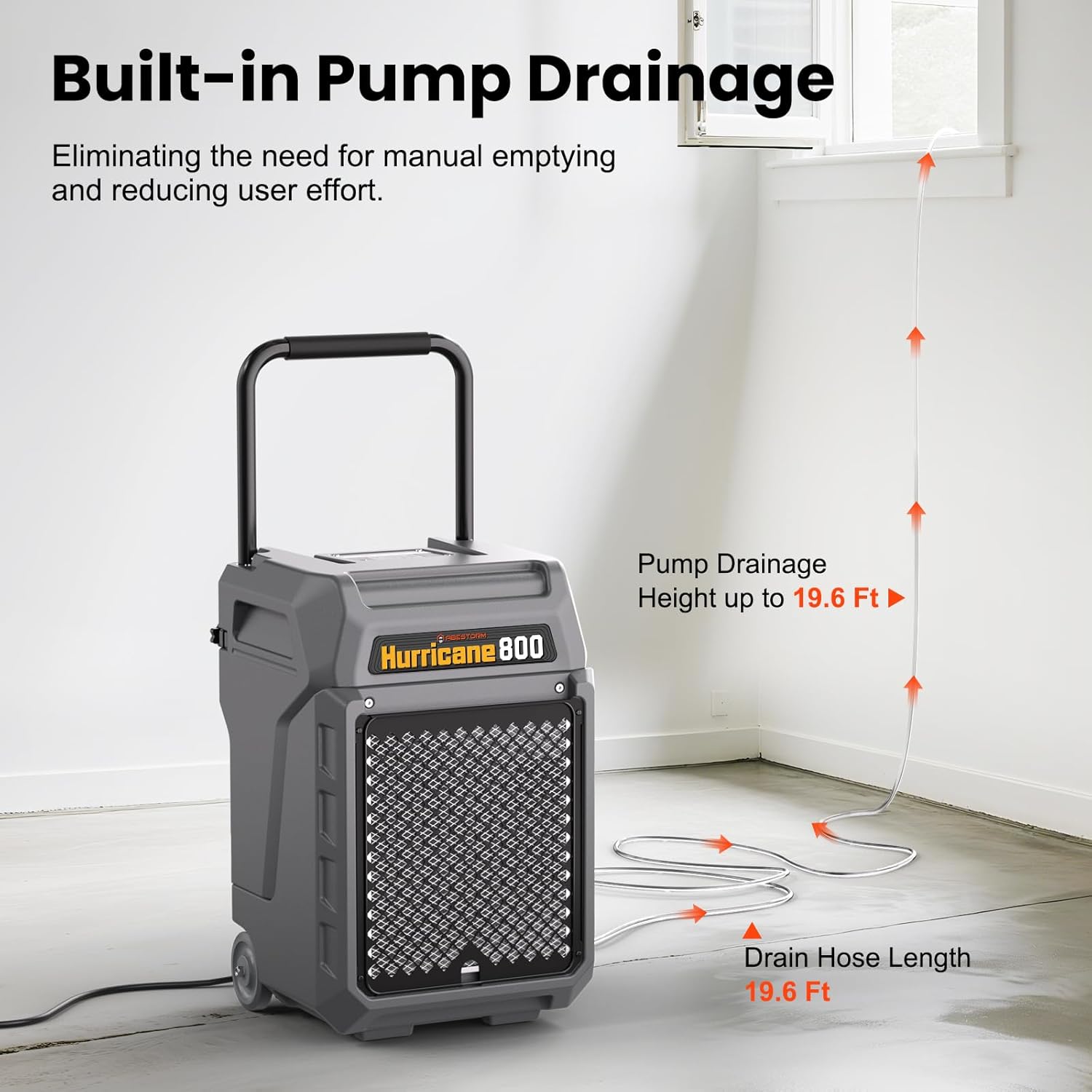 Built-In Condensate PumpThe integrated high-performance pump enables continuous drainage with a 19.6ft vertical lift capacity, eliminating manual water removal. Perfect for demanding applications including flood restoration, basement drying, commercial laundries, laboratories, and industrial workspaces, providing reliable and efficient moisture removal for both residential and commercial spaces.
