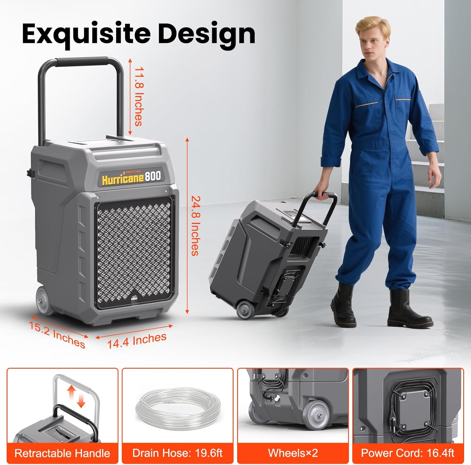Ergonomic and Durable DesignThis commercial dehumidifier engineered with rugged construction, retractable handle, durable rubber wheels and Includes onboard storage for the 16.4ft power cord for easy mobility. The advanced Rare Earth Alloy Evaporator enhances durability for long-term performance.