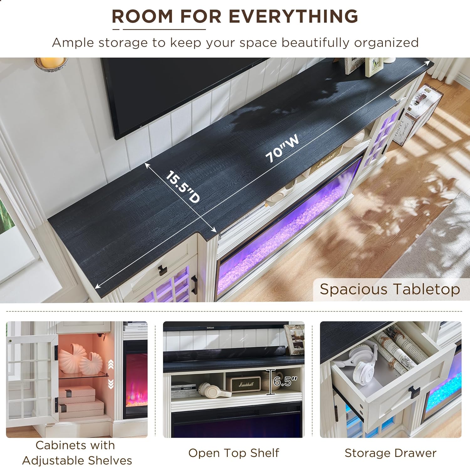 SOPHISTICATED STORAGE SOLUTION: Keep your living space neat and stylish with abundant storage options, featuring 2 top drawers, a semi-open shelf, and 2 side glass cabinets with adjustable shelvesideal for organizing your essentials. The 70" wide tabletop accommodates TVs up to 80", making it the perfect centerpiece for any home entertainment setup