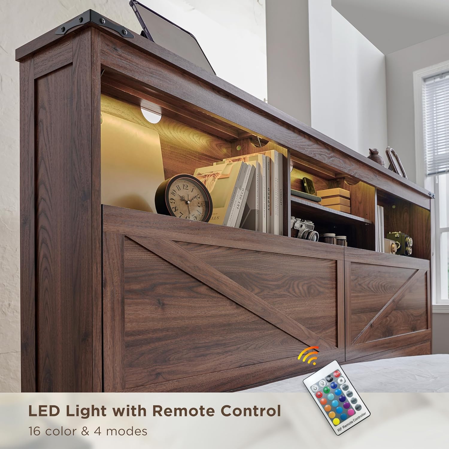 52" Tall LUXURY FARMHOUSE BED HEADBOARD: The carefully crafted 52" tall storage headboard bed frame makes it easier to sit up when you get up, reduces stress on your lower back and back, improves comfort, and increases extra storage space. With high quality faux solid wood texture, it is destined to be a high-end eye-catching piece of furniture in your bedroom.