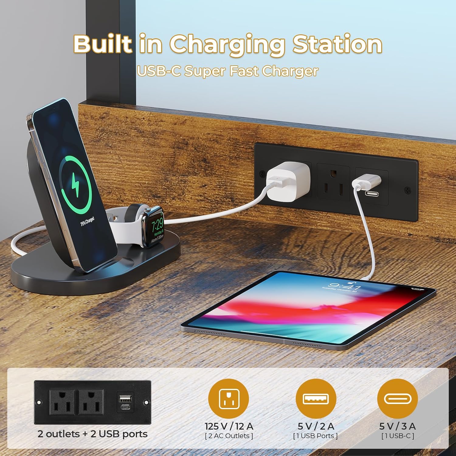 Integrated Desk with Charging Station: The bunk beds with a built-in side desk features a dedicated charging station with 2 AC outlets, 1 USB port and 1 fast-charging Type C port. It ensures your devices stay charged within easy reach, allowing you to safely power them up from the comfort of your bed and never scramble for a plug.