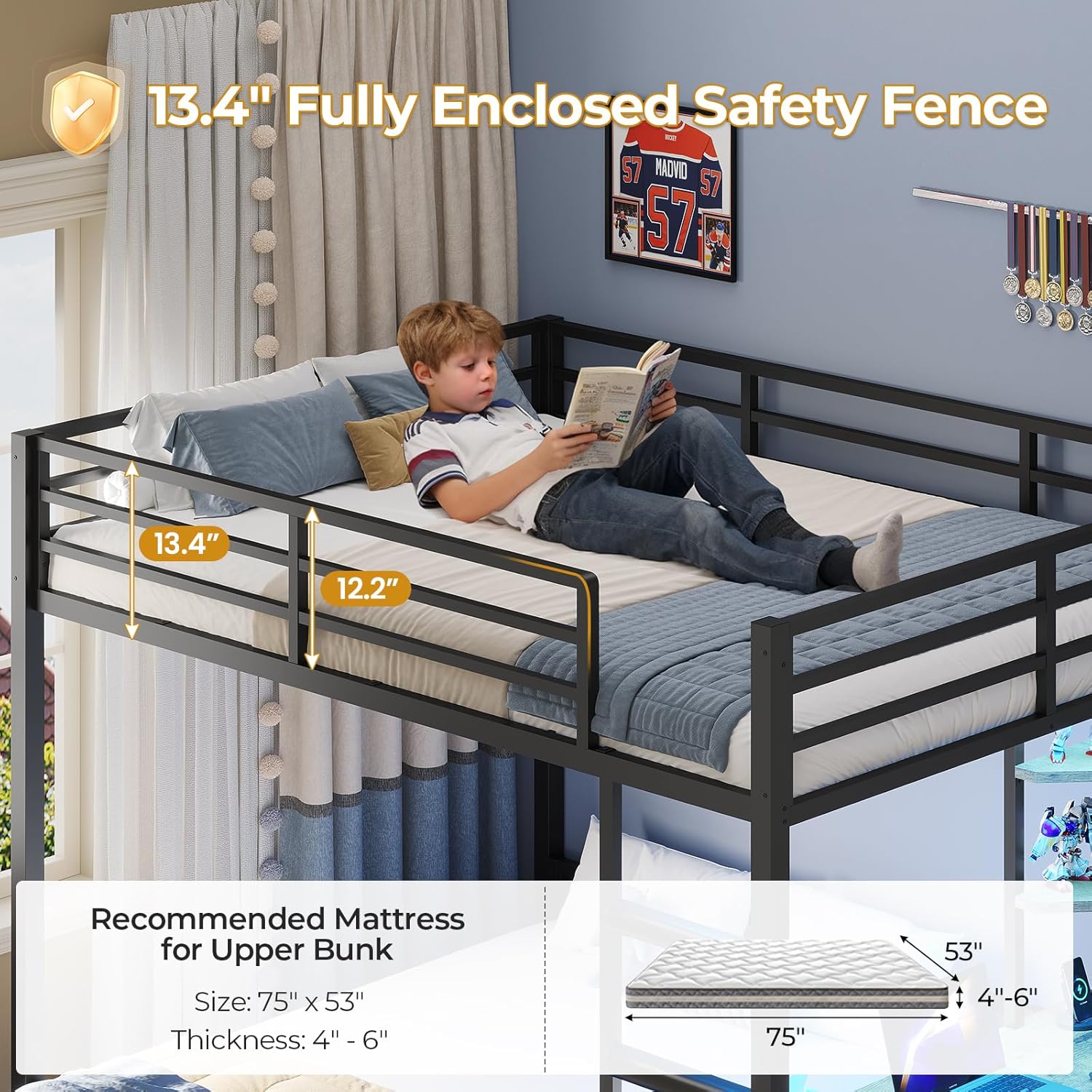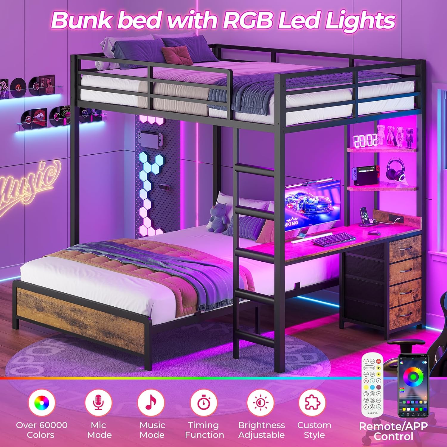 Bunk Bed With Led Lights: The full over full bunk bed is equipped with RGB LED lights, which can be controlled remotely via APP, over 60,000 colors and 29 blinking modes for you to choose. The LED lights have a music synchronization function, built-in microphone with adjustable sensitivity, and the color of the LED lights will change according to the rhythm of the sound and music.