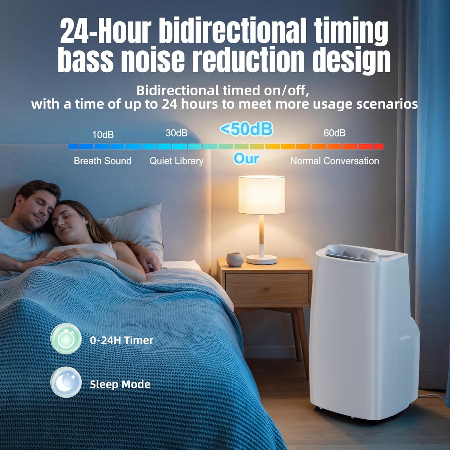 Smart Sleep Mode, 24-Hour Timer for Energy Savings: In sleep mode, the portable air conditioner automatically adjusts fan speed and temperature based on internal sensors to provide a quiet sleep environment under 50 decibels. Additionally, it features a timer ranging from 0.5 to 24 hours, allowing you to preset the device's shutdown time to conserve energy.