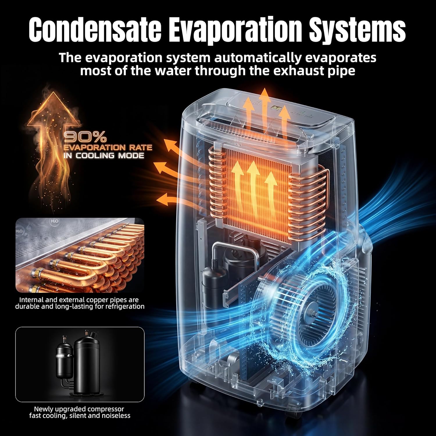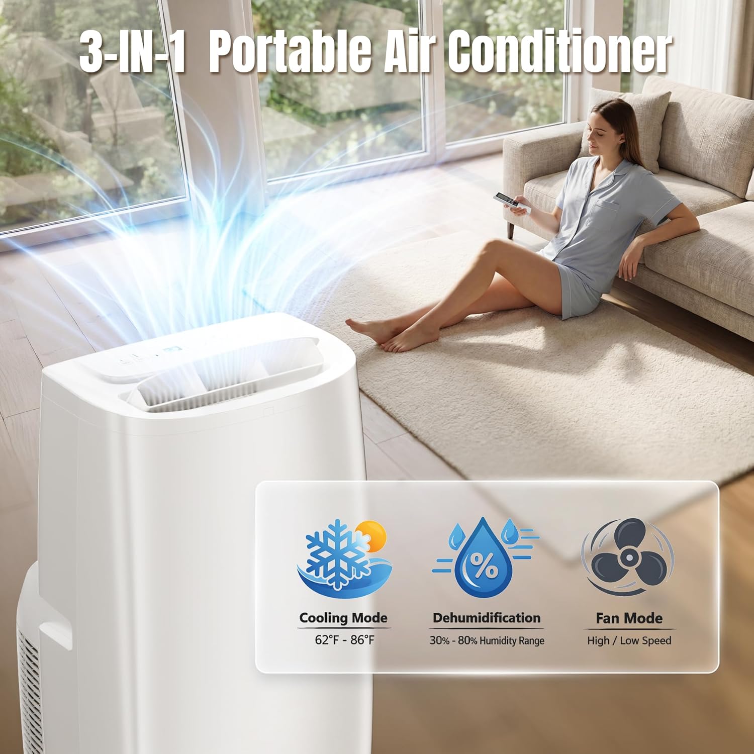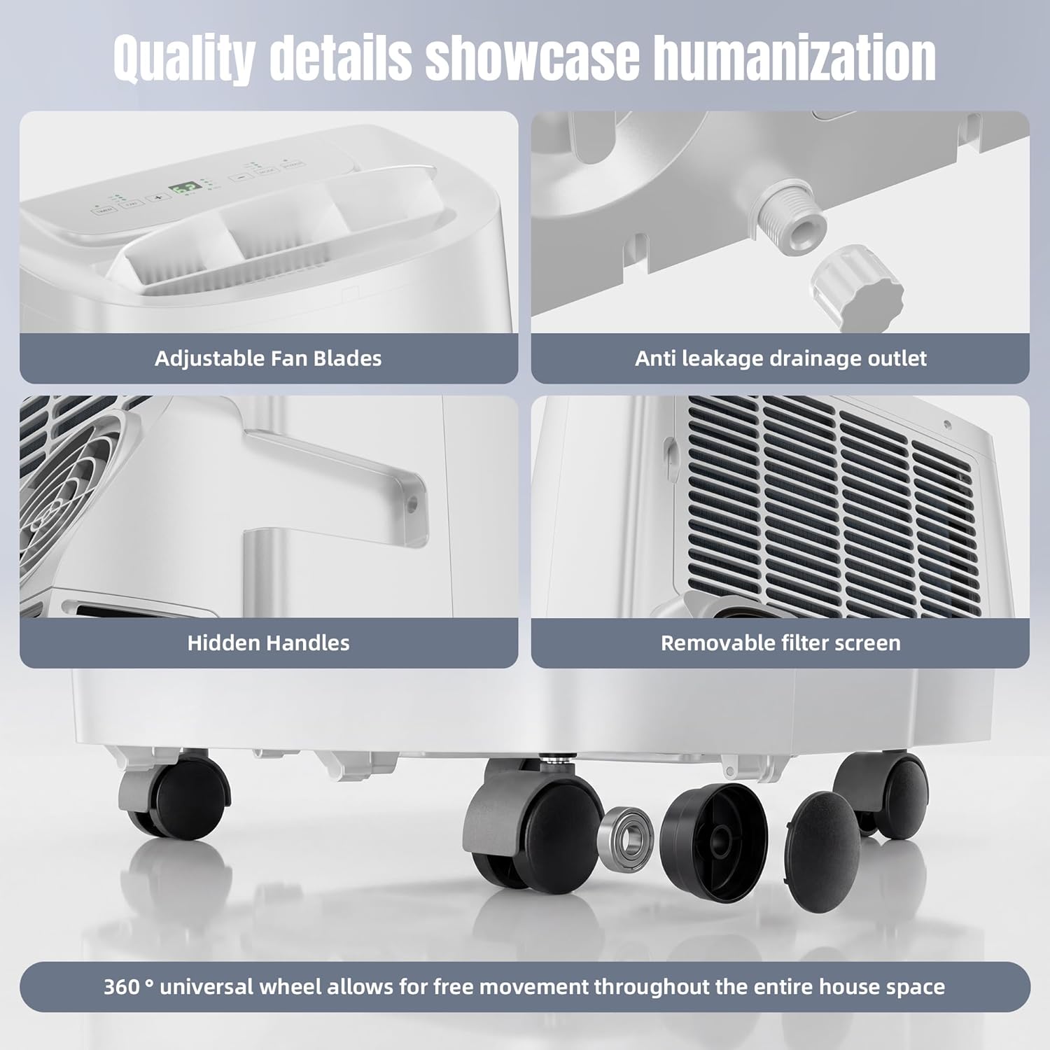 Multi-Functional User-Friendly Design: This portable air conditioner features three core functionscooling, fan, and dehumidification modesallowing easy adjustment to suit your needs. In dehumidification mode, the unit efficiently removes up to 1.8L/H of moisture per hour, effectively alleviating humidity issues. Equipped with an efficient self-evaporating system, it recycles condensate water, significantly reducing manual drainage needs. When using the drainage mode or in high-humidity environments, you can connect the drain hose to either the middle or bottom drainage ports for continuous, uninterrupted drainage.