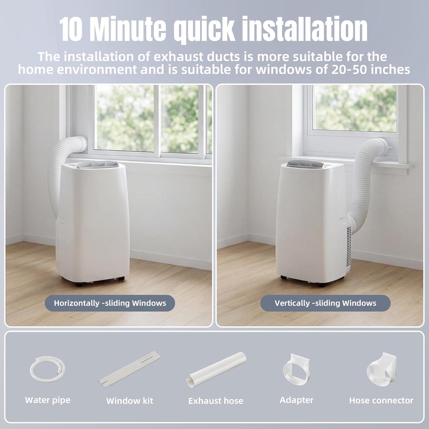 10-Minute Easy Installation: Installing this portable air conditioner is incredibly simple. Just place it in your desired area, then attach the included hose and window adapter. The kit contains an exhaust hose, hose connector, water hose, adapter, and window kit. This unit is designed to work with double-hung/single-hung windows and sliding windows.