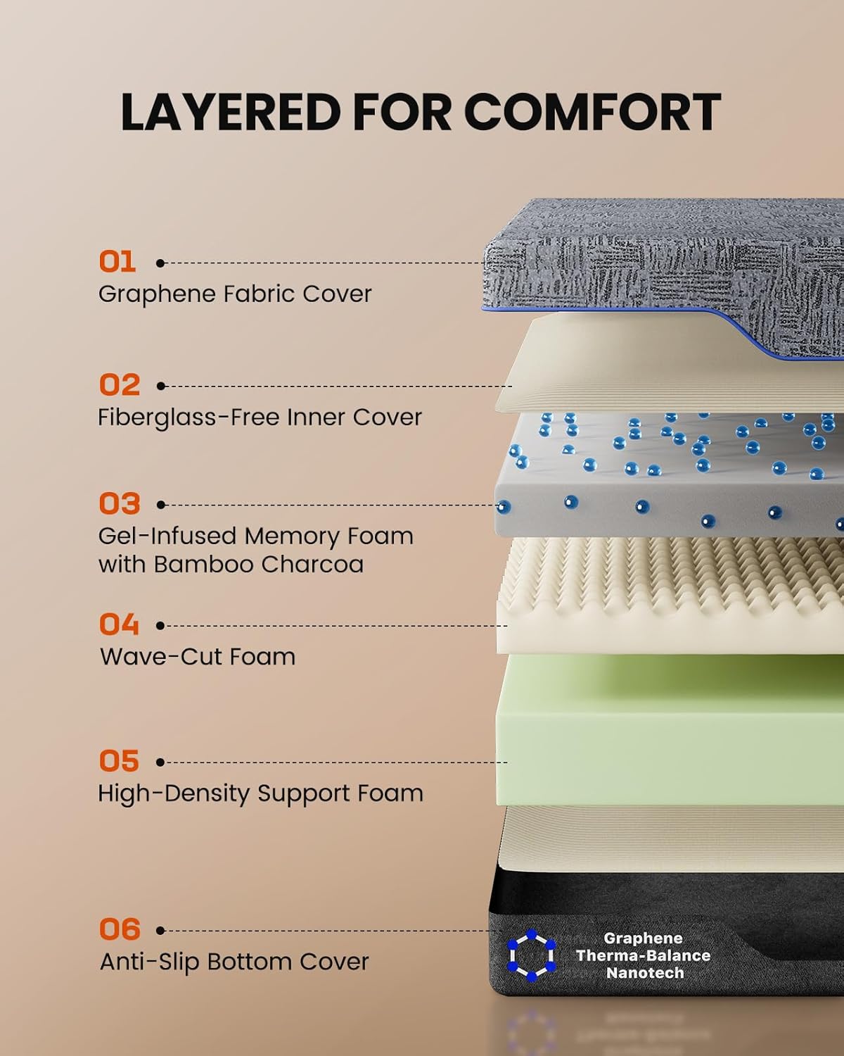 Cooling Graphene Cover & Supportive Foam Layers: Stay cool with a breathable graphene-infused cover. Layers of gel-infused memory foam and wave-cut foam help relieve pressure while supporting spinal alignment. Medium-firm feel, CertiPUR-US certified, and fiberglass-free.